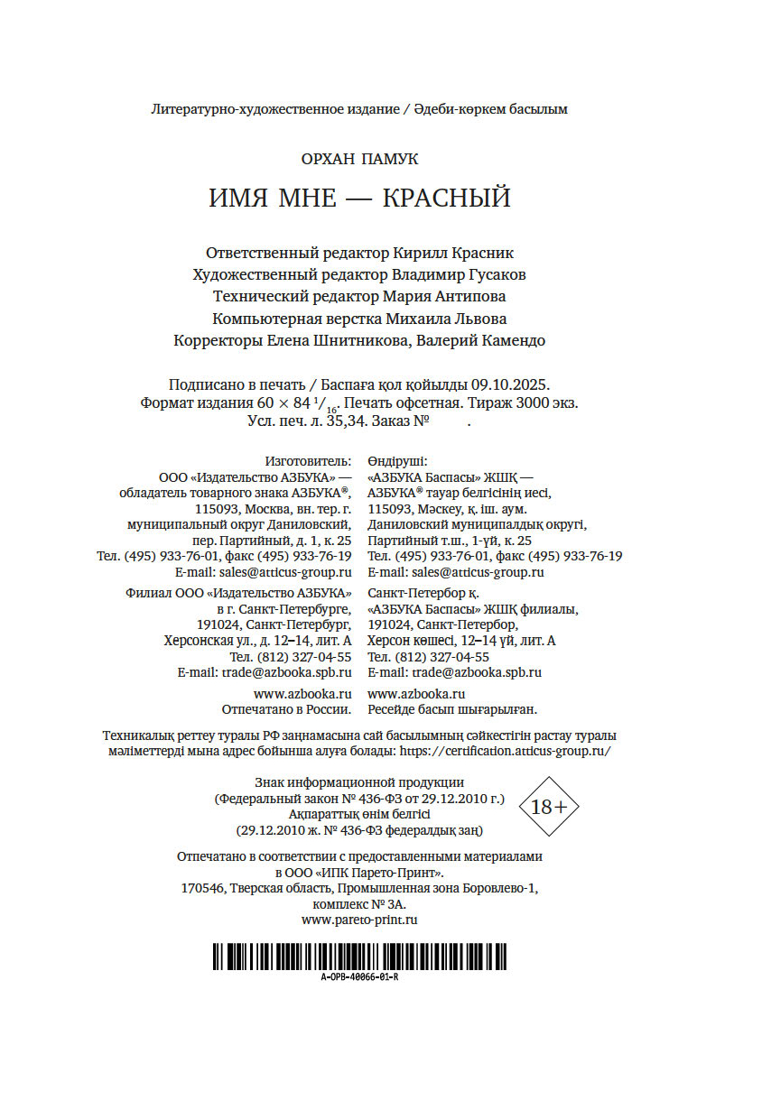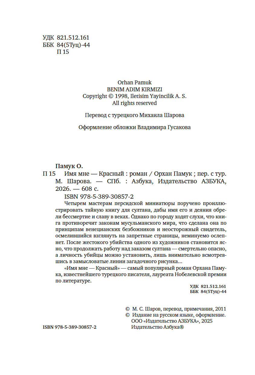 "Имя мне – Красный" – самый популярный роман Орхана Памука, известнейшего турецкого писателя, лауреата Нобелевской премии по литературе.