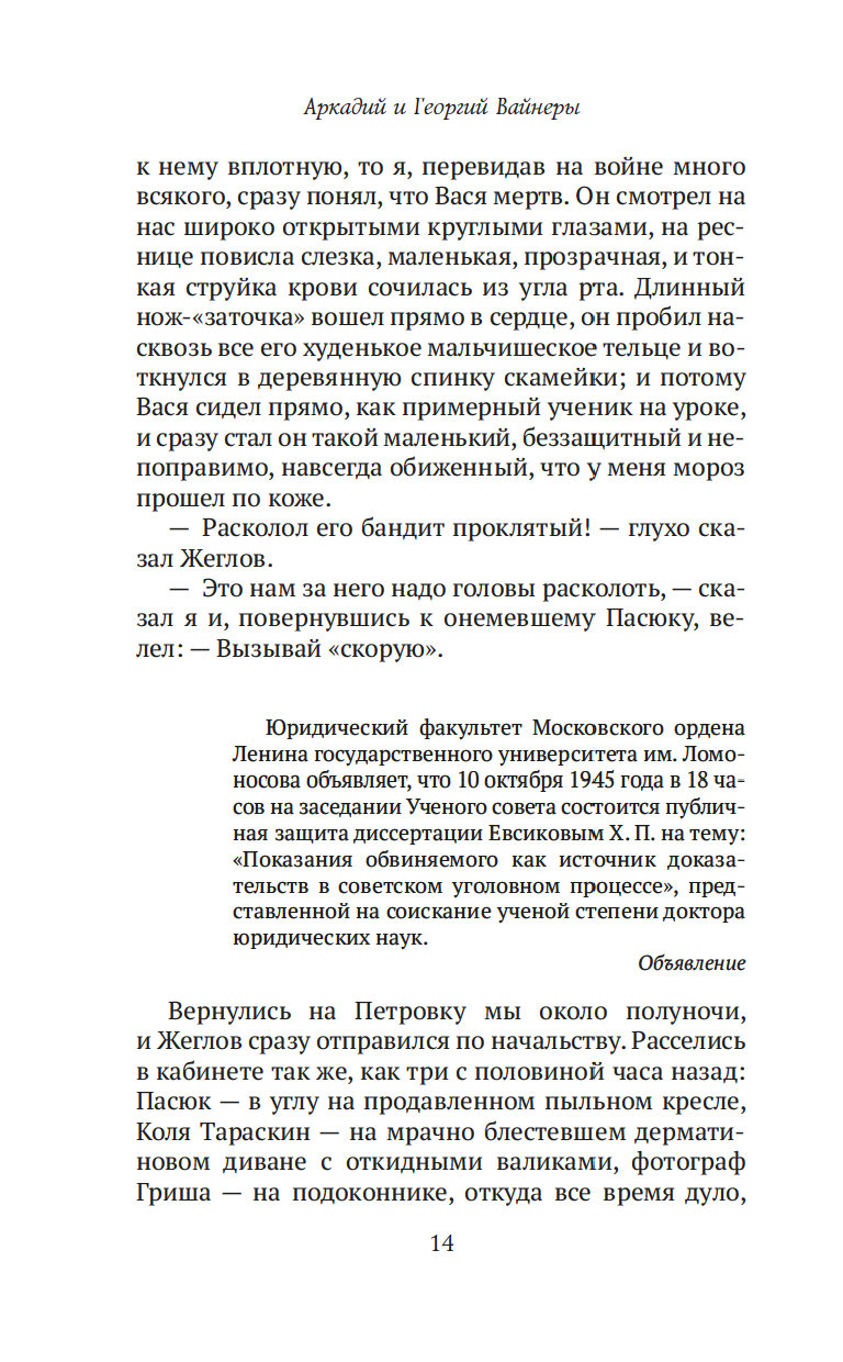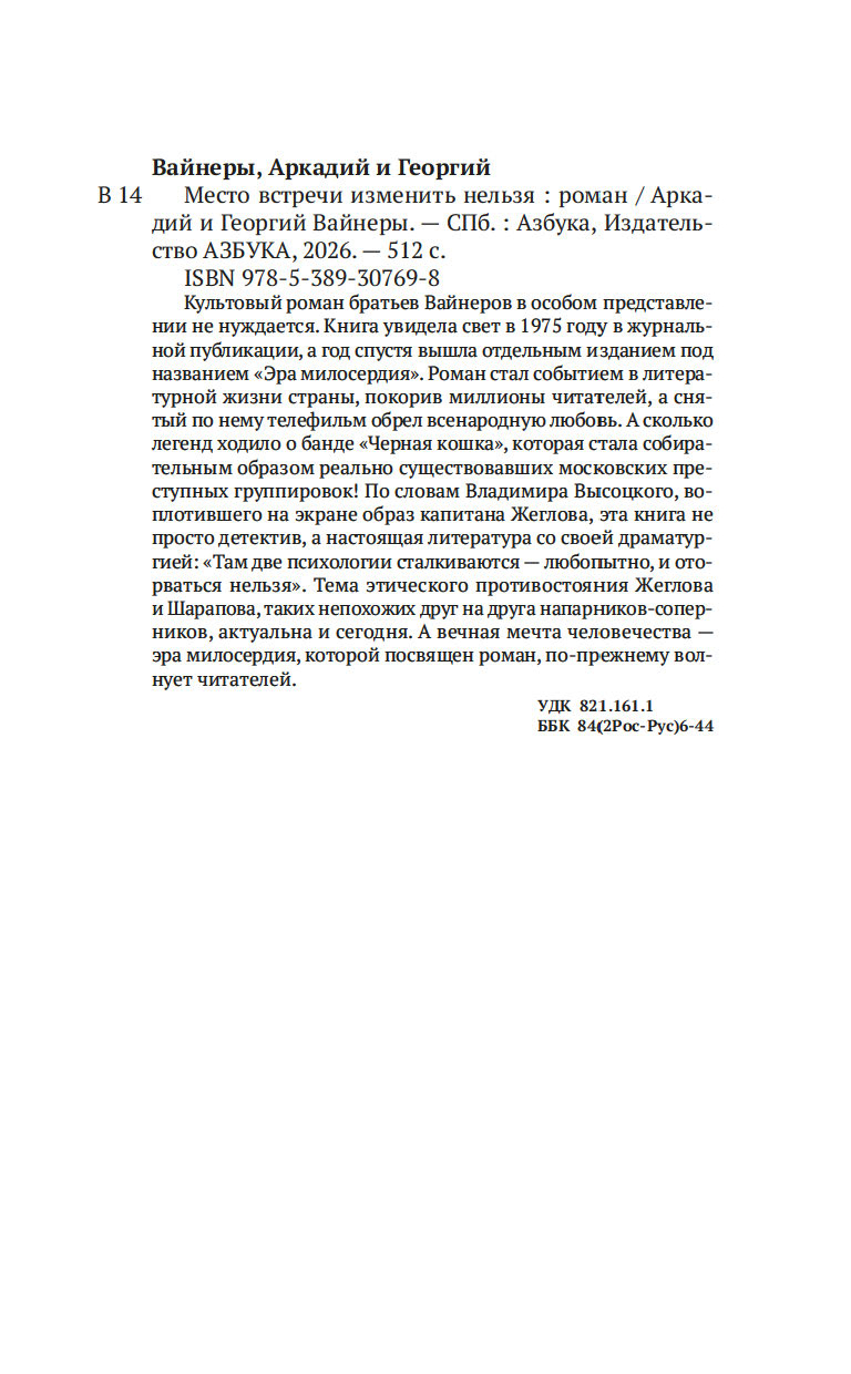 Культовый роман братьев Вайнеров в особом представлении не нуждается. Книга увидела свет в 1975 году в журнальной публикации, а год спустя вышла отдельным изданием под названием "Эра милосердия". Роман стал событием в литературной жизни страны, покорив миллионы читателей, а снятый по нему телефильм обрел всенародную любовь. А сколько легенд ходило о банде "Черная кошка", которая стала собирательным образом реально существовавших московских преступных группировок! По словам Владимира Высоцкого, воплотившего на экране образ капитана Жеглова, эта книга не просто детектив, а настоящая литература со своей драматургией: "Там две психологии сталкиваются – любопытно, и оторваться нельзя". Тема этического противостояния Жеглова и Шарапова, таких непохожих друг на друга напарников-соперников, актуальна и сегодня. А вечная мечта человечества – эра милосердия, которой посвящен роман, по-прежнему волнует читателей.