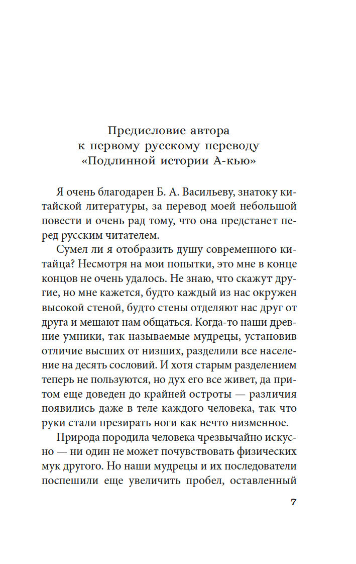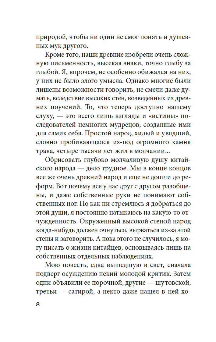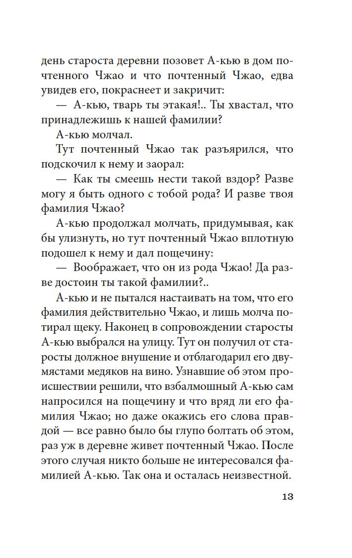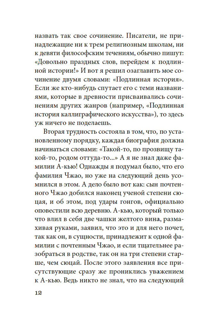 "Подлинная история А-кью" – маленький шедевр китайской литературы начала XX века, первое произведение, в полной мере раскрывающее богатство разговорного китайского языка. Повесть моментально получила международное признание и вывела творчество Лу Синя на мировой уровень. Она была переведена более чем на тридцать языков, вошла в список 100 величайших историй всех времен по версии BBC и стала основой многочисленных адаптаций – драматических постановок, фильмов и даже балетов.