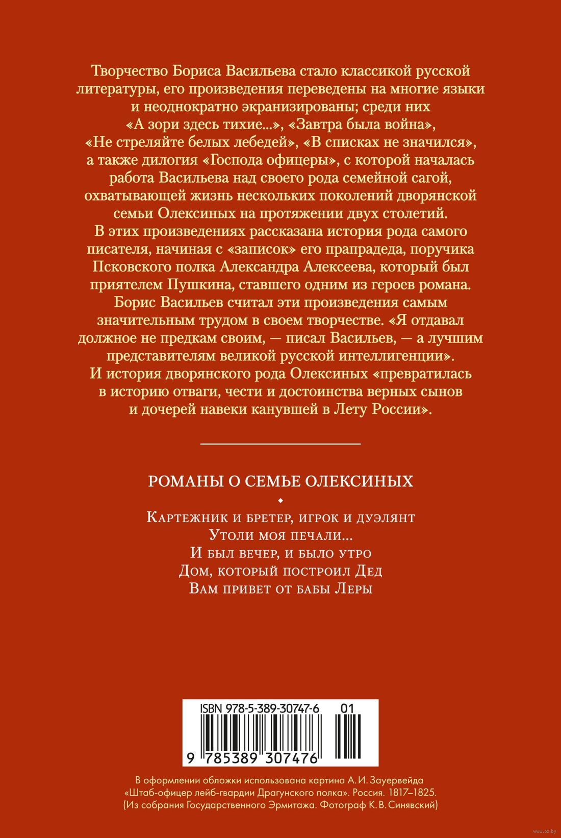 Творчество Бориса Васильева стало классикой русской литературы, его произведения переведены на многие языки и неоднократно экранизированы; среди них "А зори здесь тихие...", "Завтра была война", "Не стреляйте белых лебедей", "В списках не значился", а также дилогия "Господа офицеры", с которой началась работа Васильева над своего рода семейной сагой, охватывающей жизнь нескольких поколений дворянской семьи Олексиных на протяжении двух столетий. В этих произведениях рассказана история рода самого писателя, начиная с "записок" его прапрадеда, поручика Псковского полка Александра Алексеева, который был приятелем Пушкина, ставшего одним из героев романа. Борис Васильев считал эти произведения самым значительным трудом в своем творчестве. "Я отдавал должное не предкам своим, – писал Васильев, – а лучшим представителям великой русской интеллигенции". И история дворянского рода Олексиных "превратилась в историю отваги, чести и достоинства верных сынов и дочерей навеки канувшей в Лету России".