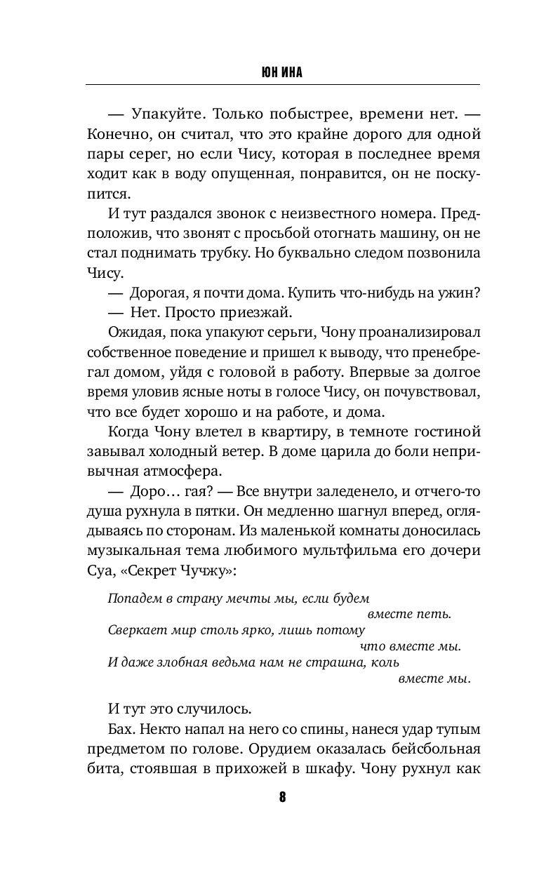 Как-то придя домой, чтобы отпраздновать с женой годовщину свадьбы, он вдруг получил страшный удар по голове. Чону лежал без сознания четыре дня. А когда очнулся, с ужасом узнал, что в их квартире побывал убийца, от которого он и получил травму. Неизвестный замотал скотчем лицо их маленькой дочери, а затем сбросил жену с 19-го этажа…