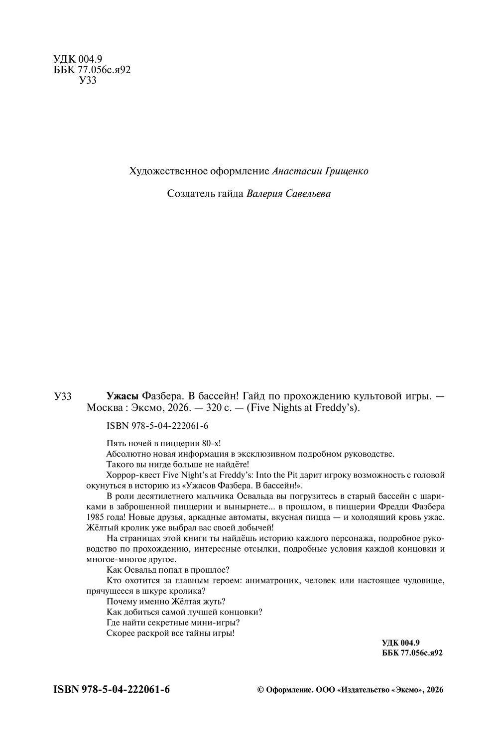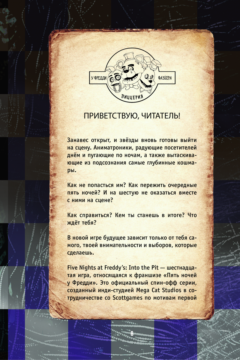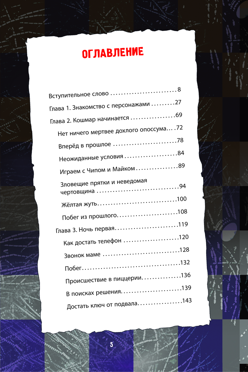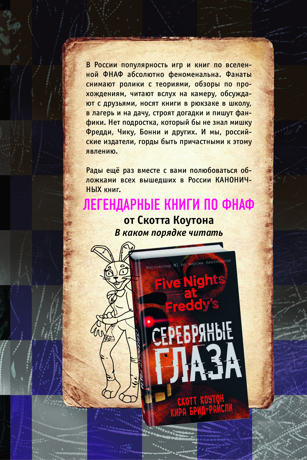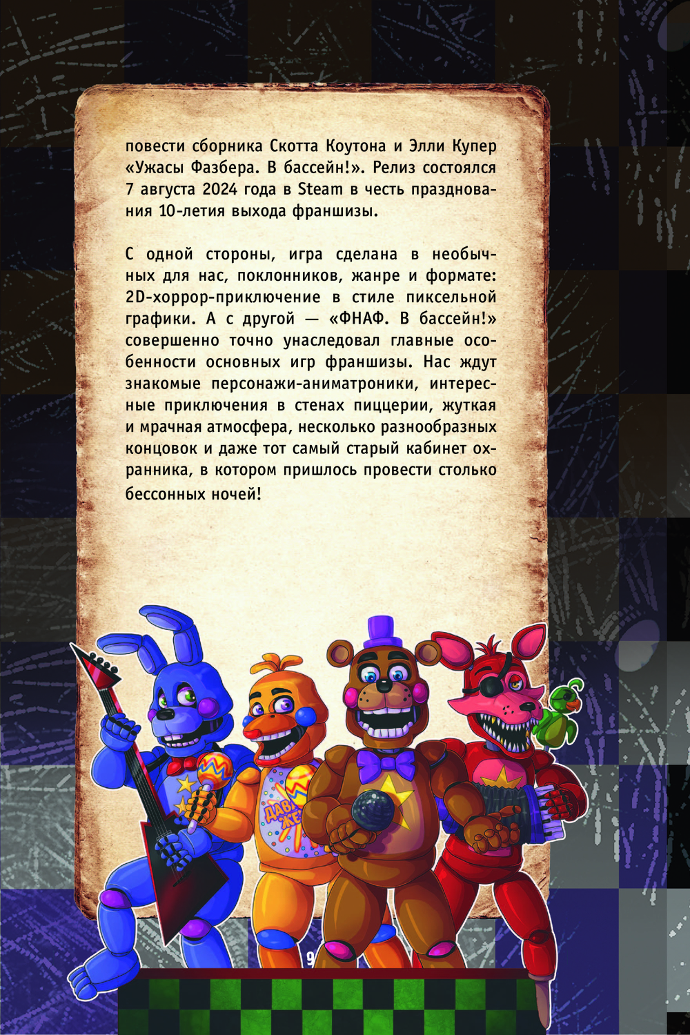 В роли десятилетнего мальчика Освальда вы погрузитесь в старый бассейн с шариками в заброшенной пиццерии и вынырнете… в прошлом, в пиццерии Фредди Фазбера 1985 года! Новые друзья, аркадные автоматы, вкусная пицца – и холодящий кровь ужас. Жёлтый кролик уже выбрал вас своей добычей! На страницах этой книги ты найдёшь историю каждого персонажа, подробное руководство по прохождению, интересные отсылки, подробные условия каждой концовки и многое-многое другое.