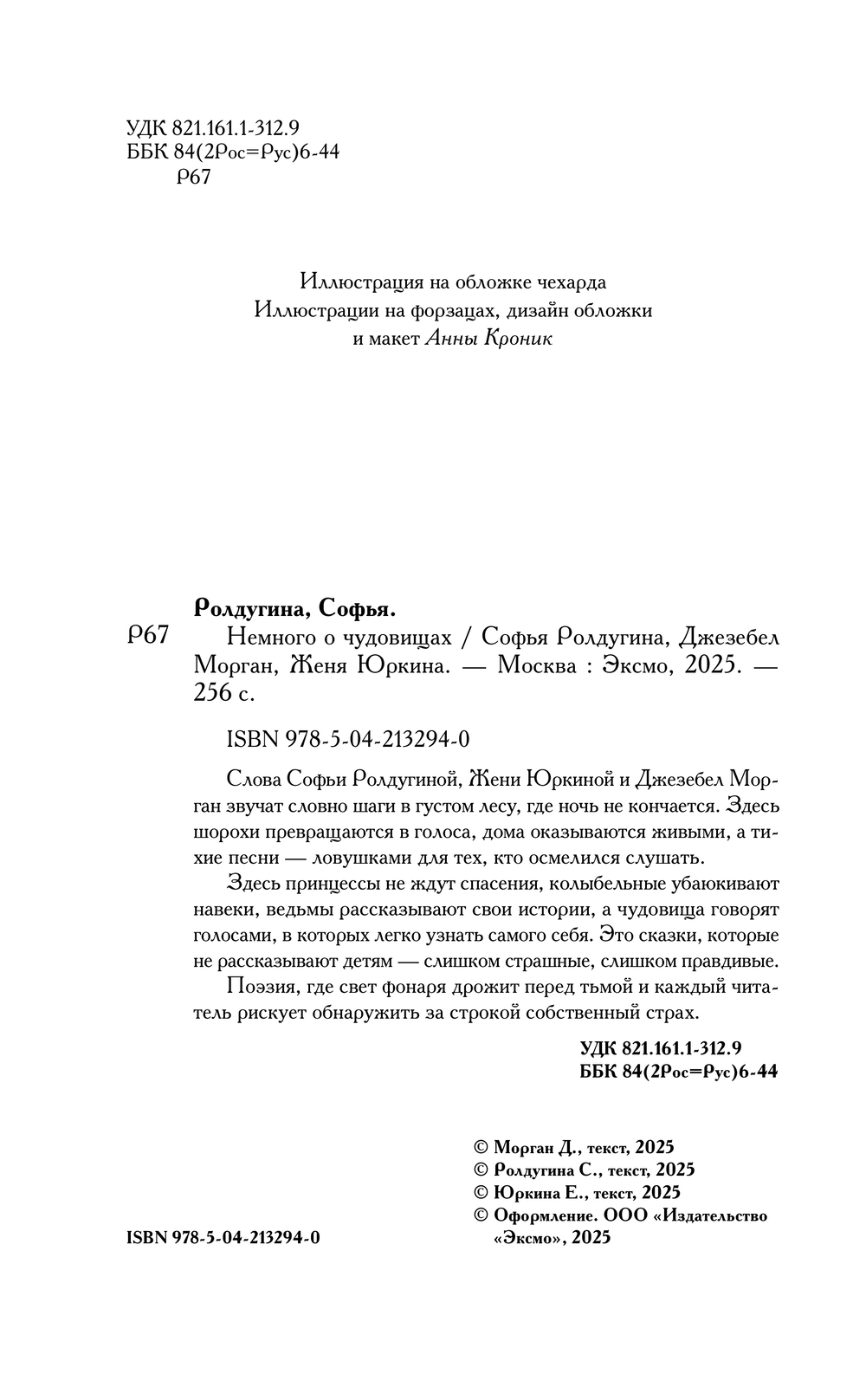 Слова Софьи Ролдугиной, Жени Юркиной и Джезебел Морган звучат, словно шаги в густом лесу, где ночь не кончается. Здесь шорохи превращаются в голоса, дома оказываются живыми, а тихие песни – ловушками для тех, кто осмелился слушать.