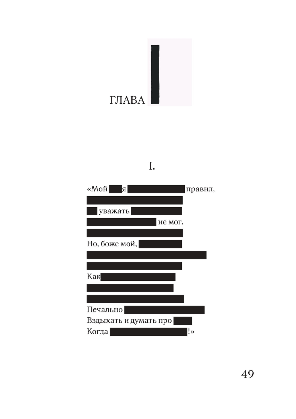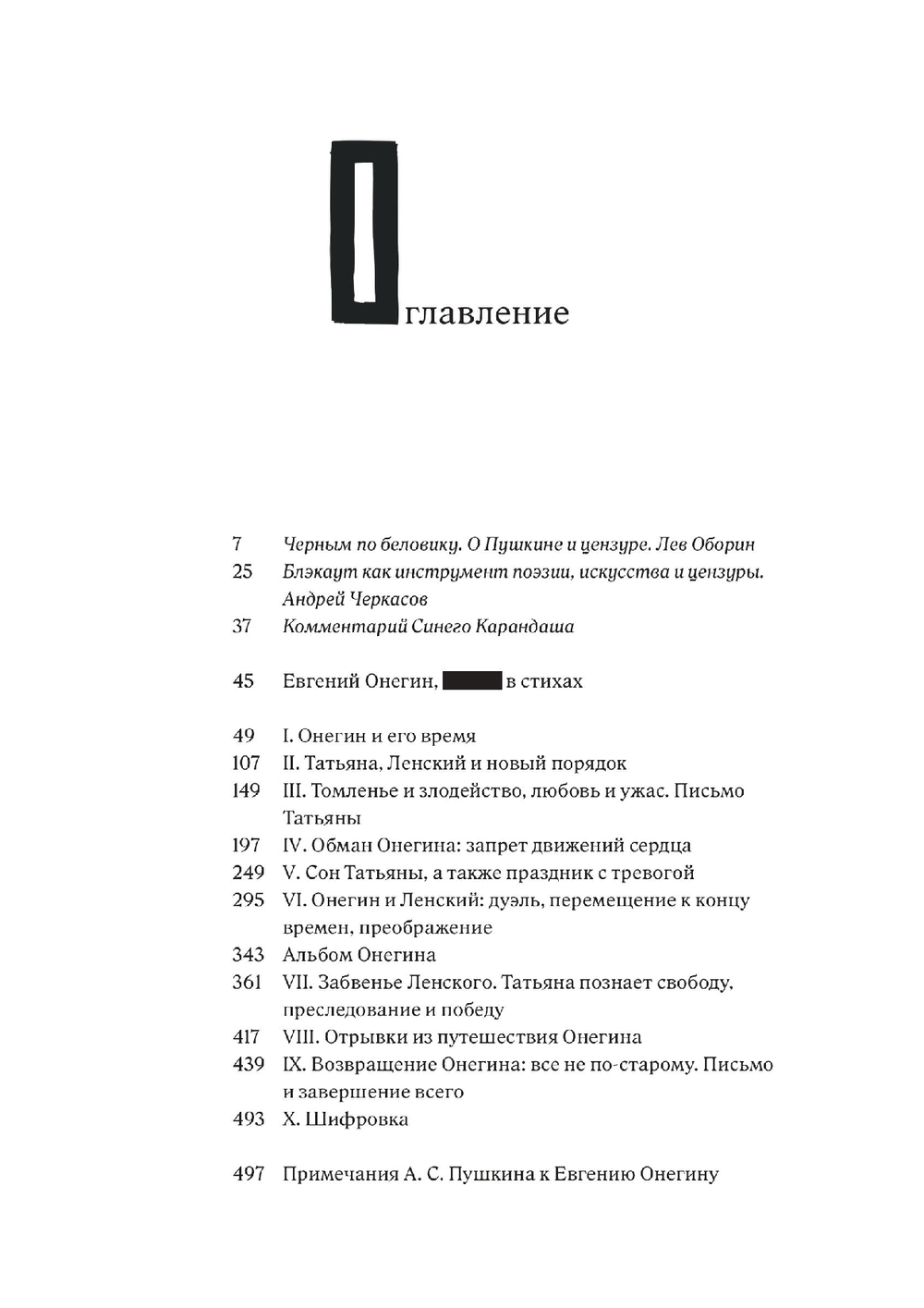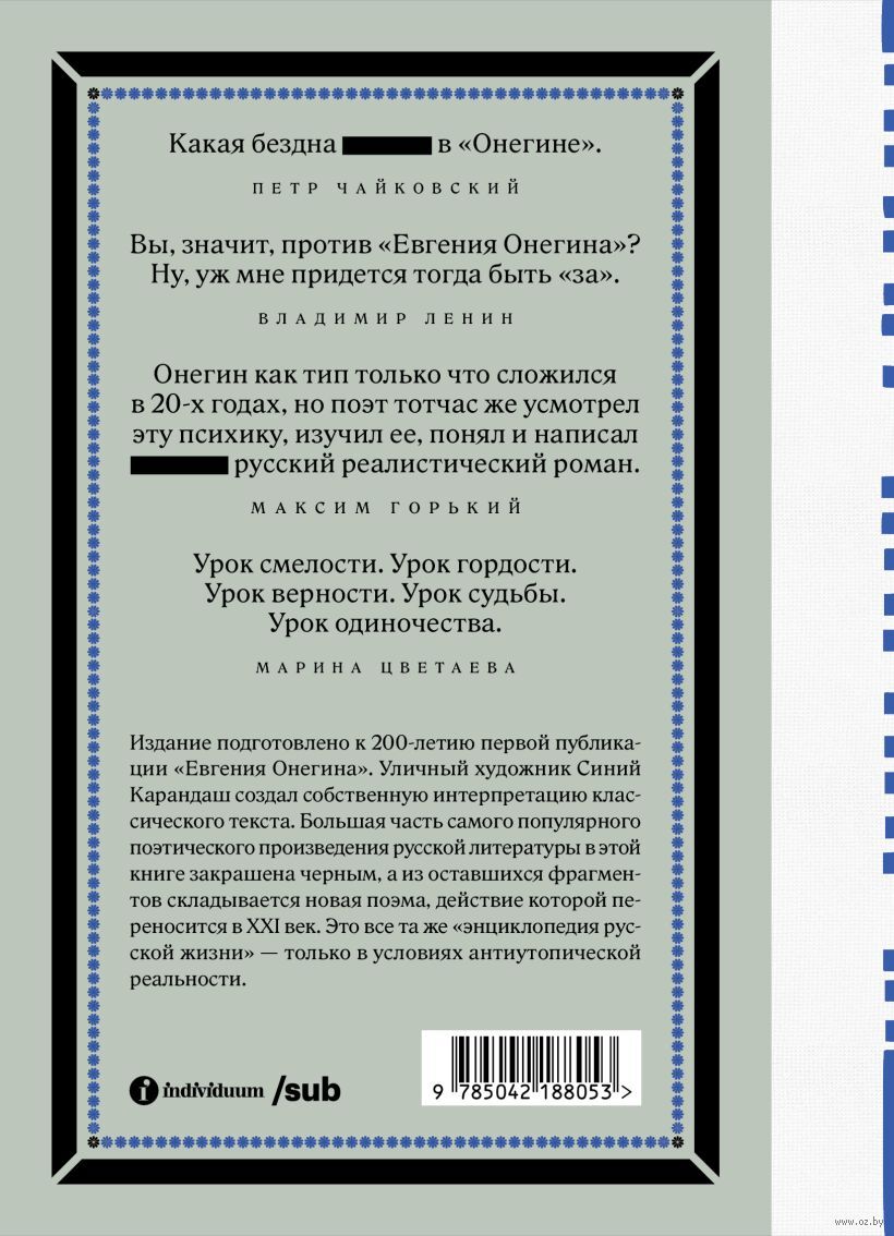 Издание подготовлено к 200-летию первой публикации "Евгения Онегина". Уличный художник Синий Карандаш создал собственную интерпретацию классического текста. Большая часть самого популярного поэтического произведения русской литературы в этой книге закрашена черным, а из оставшихся фрагментов складывается новая поэма, действие которой переносится в XXI век. Это всё та же "энциклопедия русской жизни" – только в условиях антиутопической реальности.