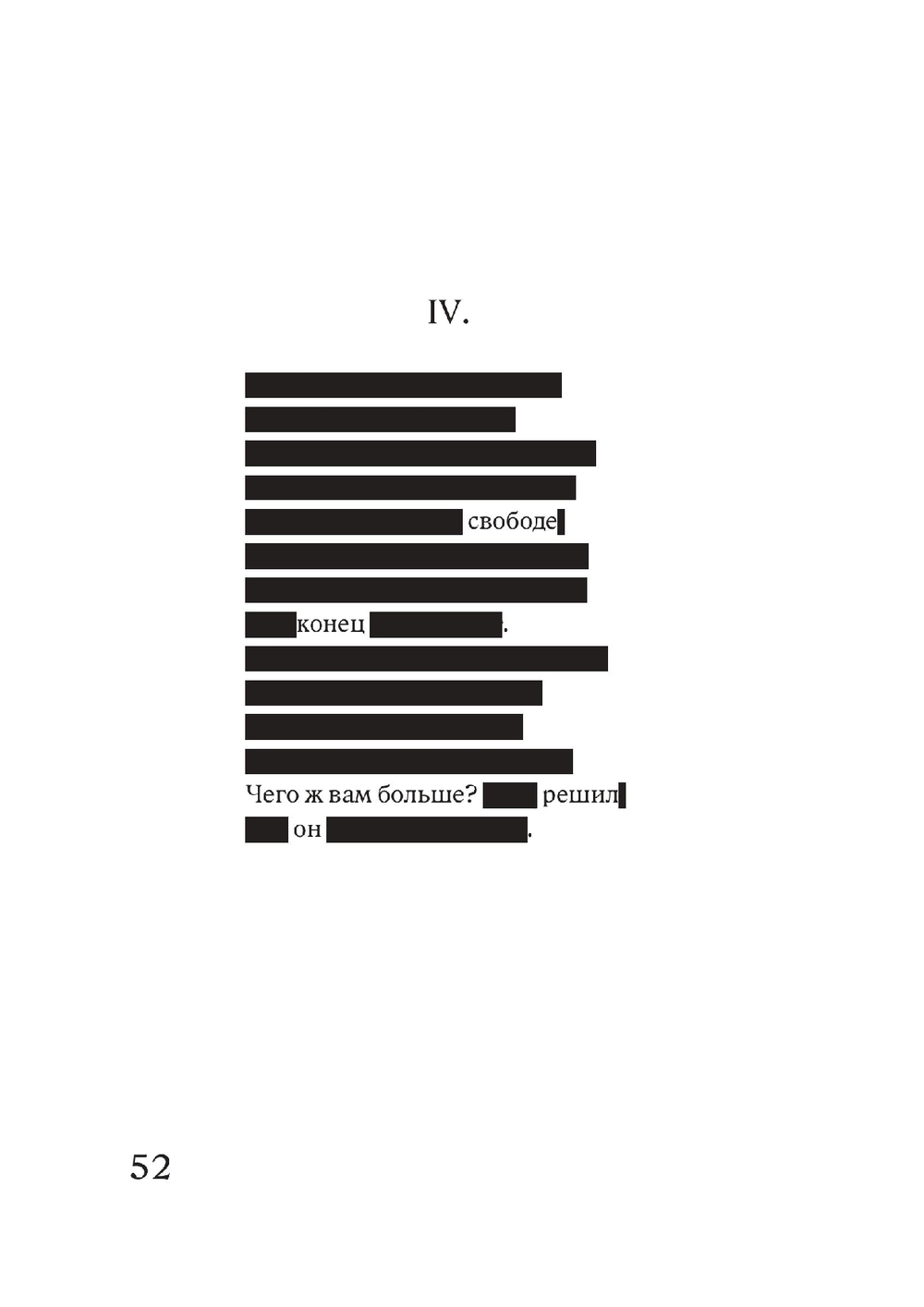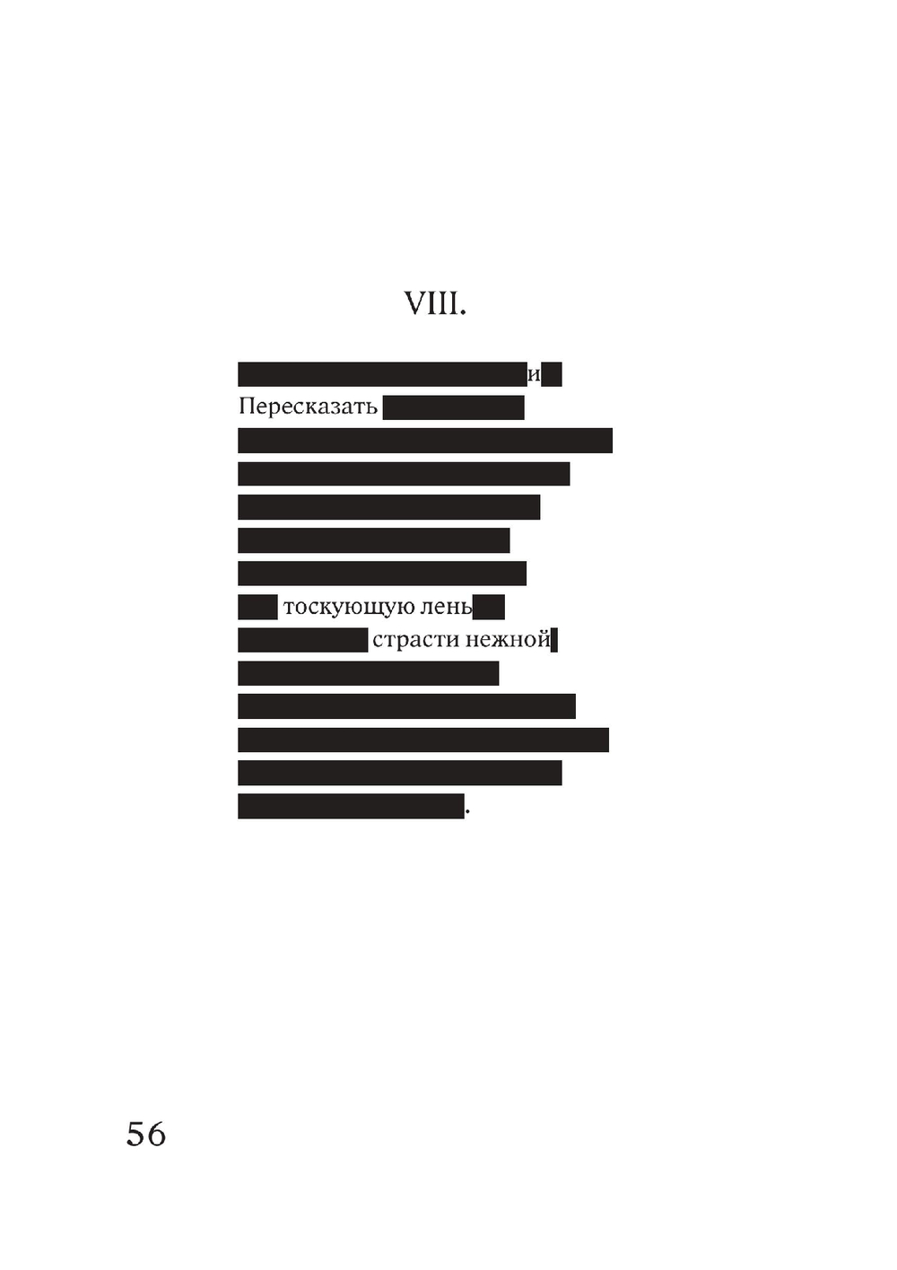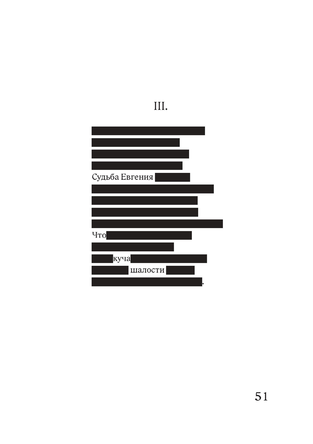 Издание подготовлено к 200-летию первой публикации "Евгения Онегина". Уличный художник Синий Карандаш создал собственную интерпретацию классического текста. Большая часть самого популярного поэтического произведения русской литературы в этой книге закрашена черным, а из оставшихся фрагментов складывается новая поэма, действие которой переносится в XXI век. Это всё та же "энциклопедия русской жизни" – только в условиях антиутопической реальности.