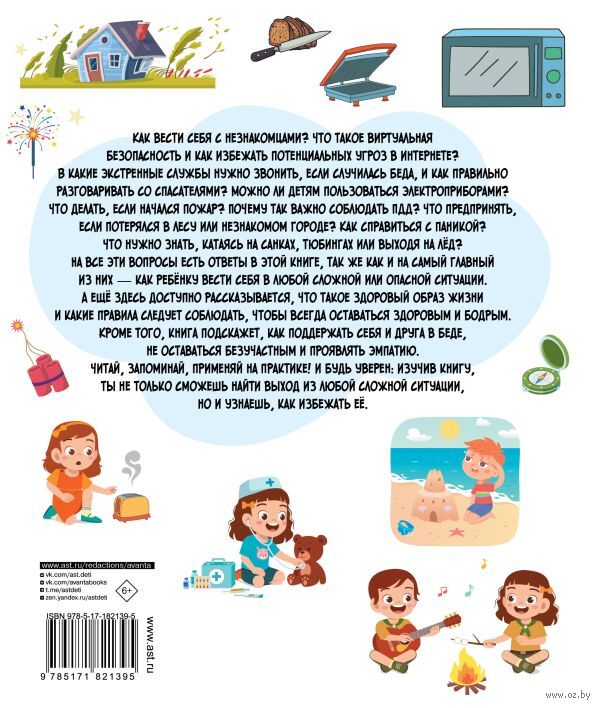 Данная книга окажет вам и вашим детям неоценимую помощь в обучении основам безопасной жизни в нашем стремительном и таком непростом мире, где, к сожалению, с каждым днём опасностей становится всё больше. Под вашим руководством и самостоятельно дети не только выучат правила поведения в ситуациях, представляющих угрозу, но и узнают, что необходимо предпринимать, чтобы не попадать в них. А если случится беда, они будут готовы применить на практике усвоенные знания и навыки и обязательно справятся с любыми трудностями. Главные правила безопасности объясняются легко и доступно, каждая тема сопровождается поучительными, а иногда и забавными диалогами детей примерно того же возраста, что и ваш ребёнок. На многочисленных примерах они объясняют, что нужно сделать, чтобы обезопасить себя, а значит, обрести уверенность в собственных силах.