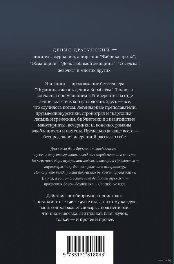 Эта книга – продолжение бестселлера “Подлинная жизнь Дениса Кораблёва”. Там дело кончается поступлением в Университет на отделение классической филологии. Здесь – всё, что случилось потом: легендарные преподаватели, друзья-однокурсники, стройотряд и “картошка”, латынь и греческий, библиотеки и византийские манускрипты, вечеринки и, конечно, романы, влюбленности и измены. Предельно (а чаще всего – беспредельно) искренний рассказ о себе.
