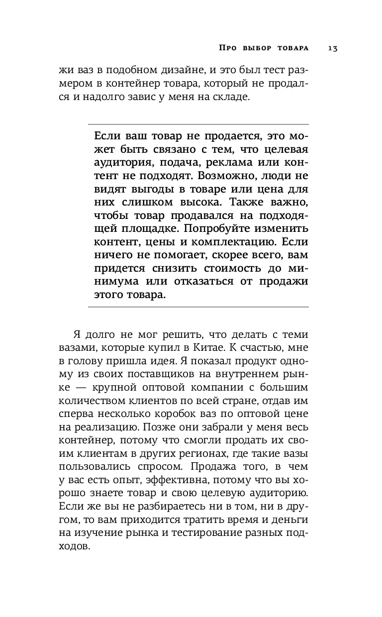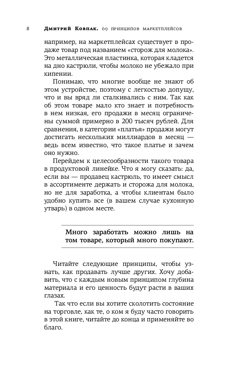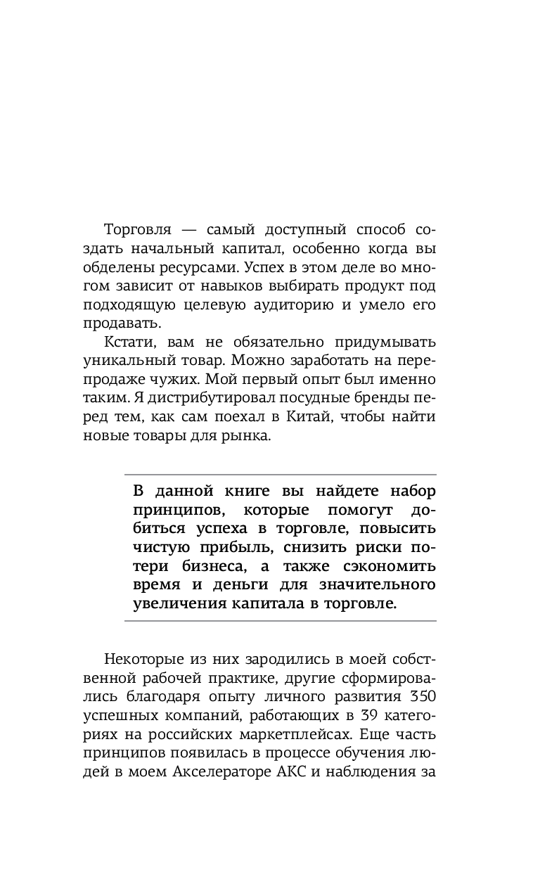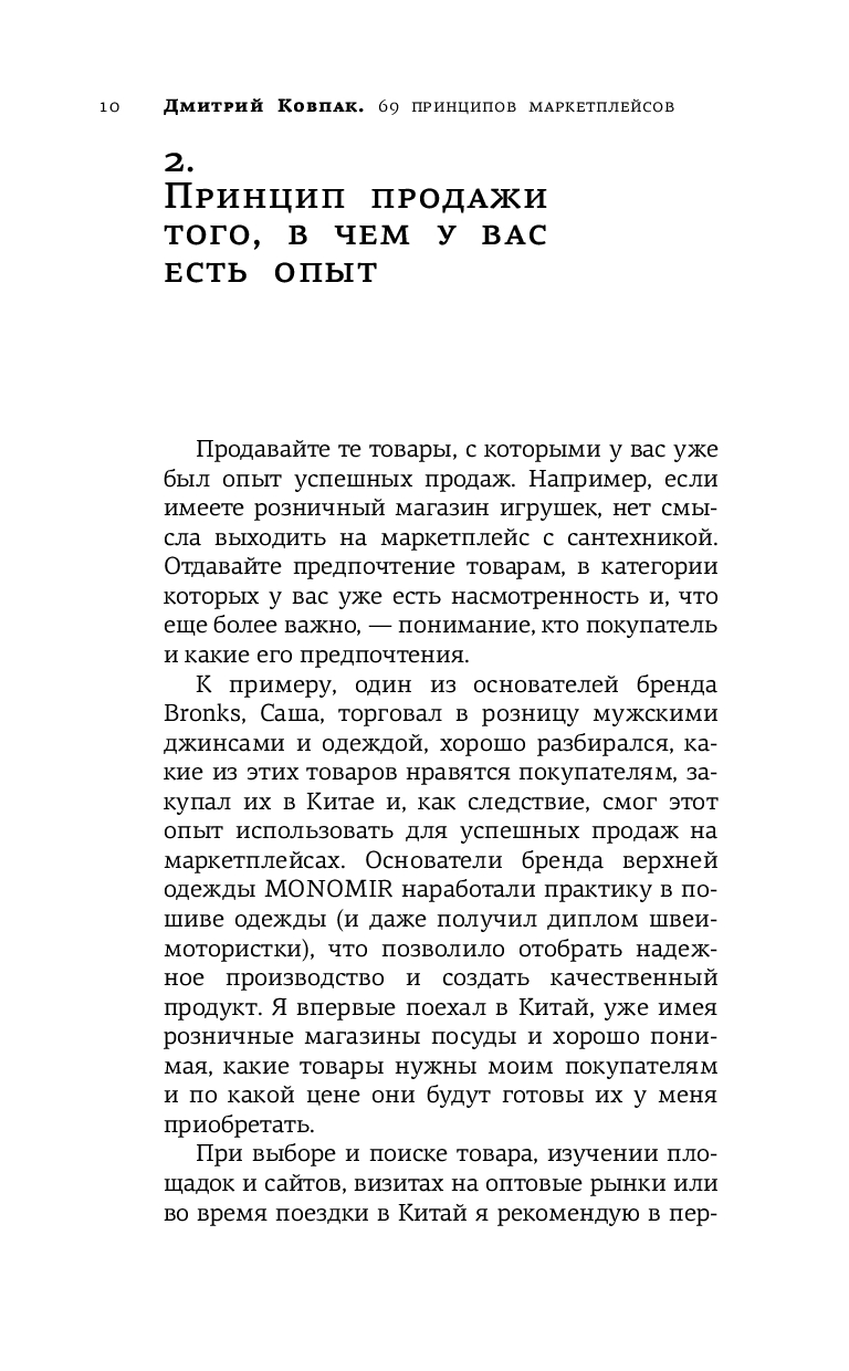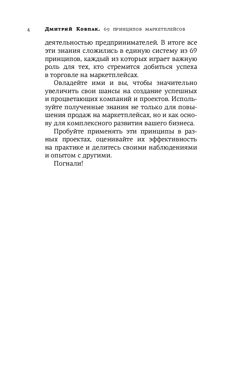 Основная компетенция Дмитрия – делать прибыль регулярной, а бизнес – конкурентным. Систематизировав свой многолетний опыт в торговле, он создал набор из 69 принципов, которые подробно и четко изложены на страницах этой книги. Знания, которыми делится Дмитрий, можно использовать не только для повышения продаж на маркетплейсах, но и как основу для комплексного развития вашего бизнеса.