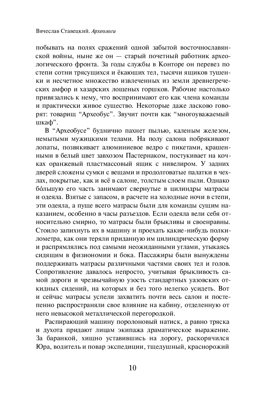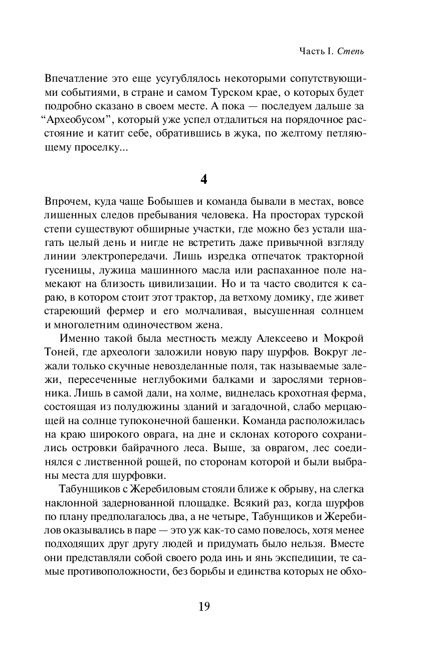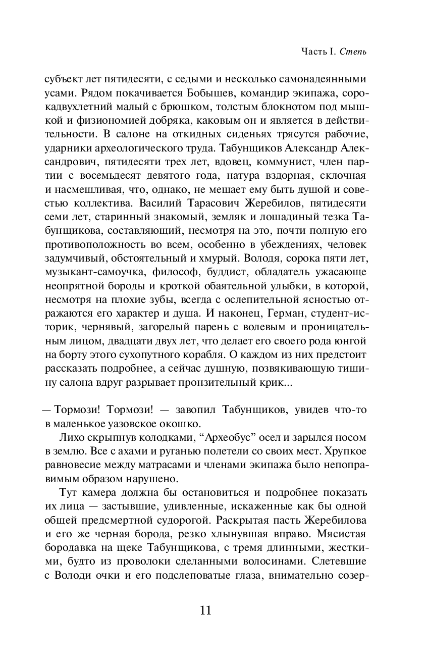 Жаркий, засушливый август, предположительно наши дни. Дикий и обманчиво безмятежный простор необъятной русской степи. По пустынным грунтовым дорогам мчится "Археобус", пыльный фургон, в котором путешествует Команда – бригада из шести археологов, выполняющих задание некоей Конторы. Они – разведчики: им предстоит исследовать берега многочисленных оврагов и рек, в поисках мест, где некогда обитал человек. Но под напором некоторых грозных внешних событий их путешествие станет больше, чем просто экспедицией, и превратится для всех шестерых в трудную, а порой и опасную одиссею...