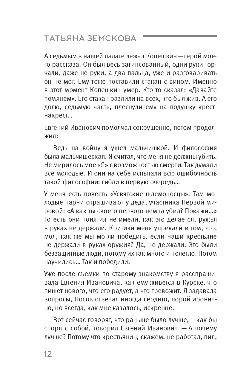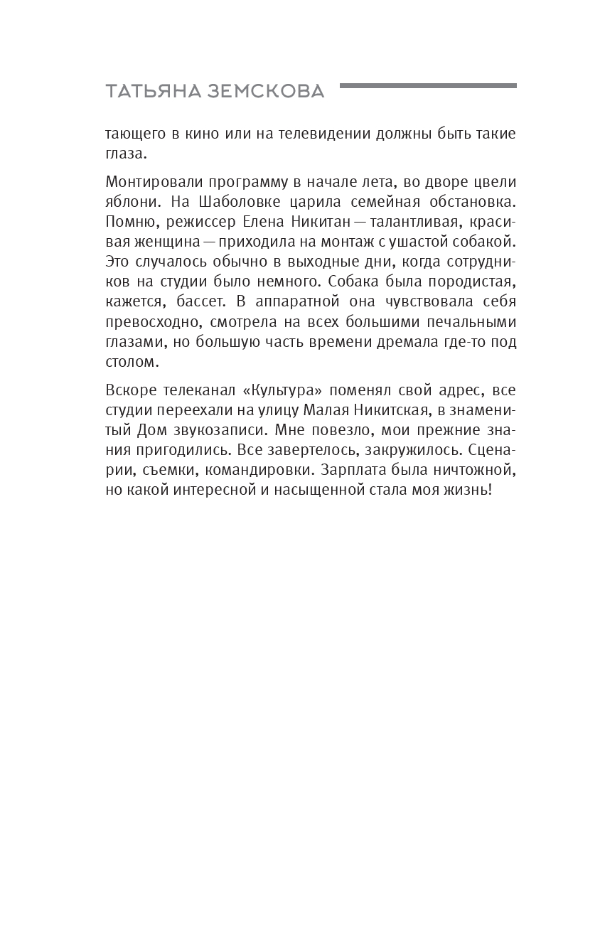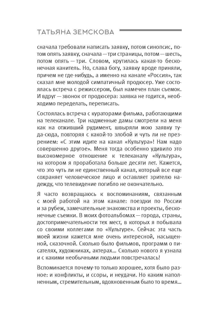 Писательница, сценаристка десятков передач на телеканале "Культура", Татьяна Сергеевна Земскова общалась с ярчайшими представителями мира кино и литературы позднесоветского периода, в судьбах которых отразились светлые и трагические события двадцатого века.