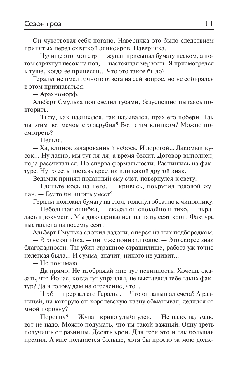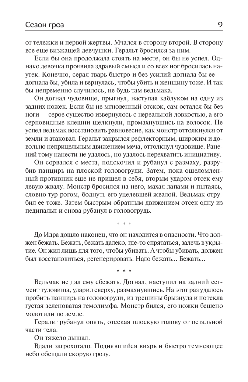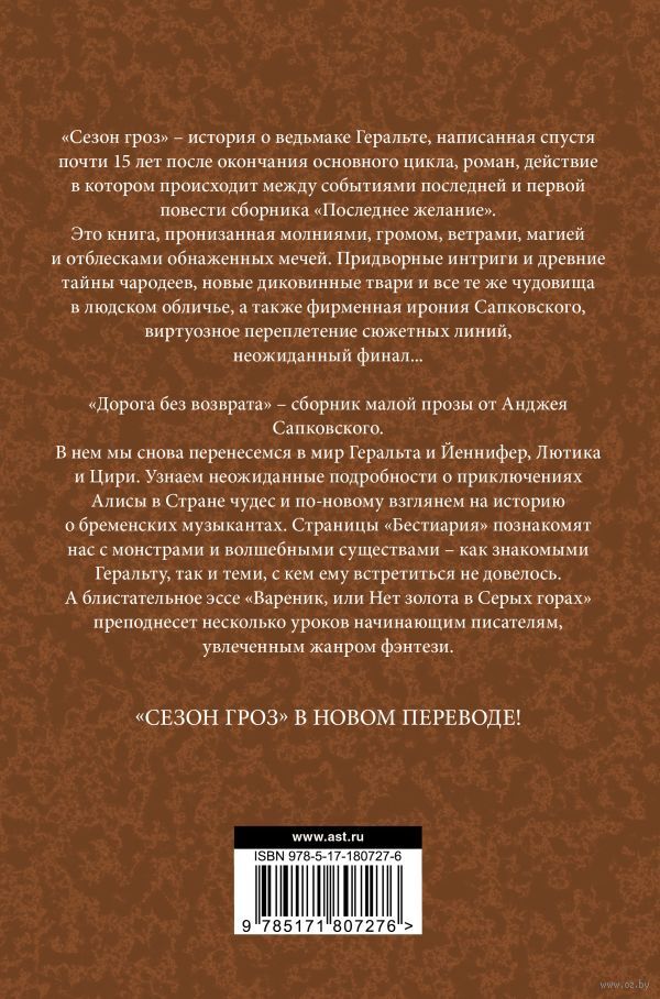 "Сезон гроз" – история о ведьмаке Геральте, написанная спустя почти 15 лет после окончания основного цикла, роман, действие в котором происходит между событиями последней и первой повести сборника "Последнее желание". "...Ибо всегда, всегда будет существовать темнота. И всегда будет царящее в темноте Зло, всегда будут в темноте клыки и когти, смерть и кровь. И всегда будут нужны ведьмаки. И хорошо бы, чтоб они всегда появлялись там, где как раз нужны. Там, откуда доносится крик о помощи.Там, откуда их зовут. Чтобы являлись, призванные, с мечом в руке. Мечом, блеск которого пронзит темноту, свет которого рассеет мрак".