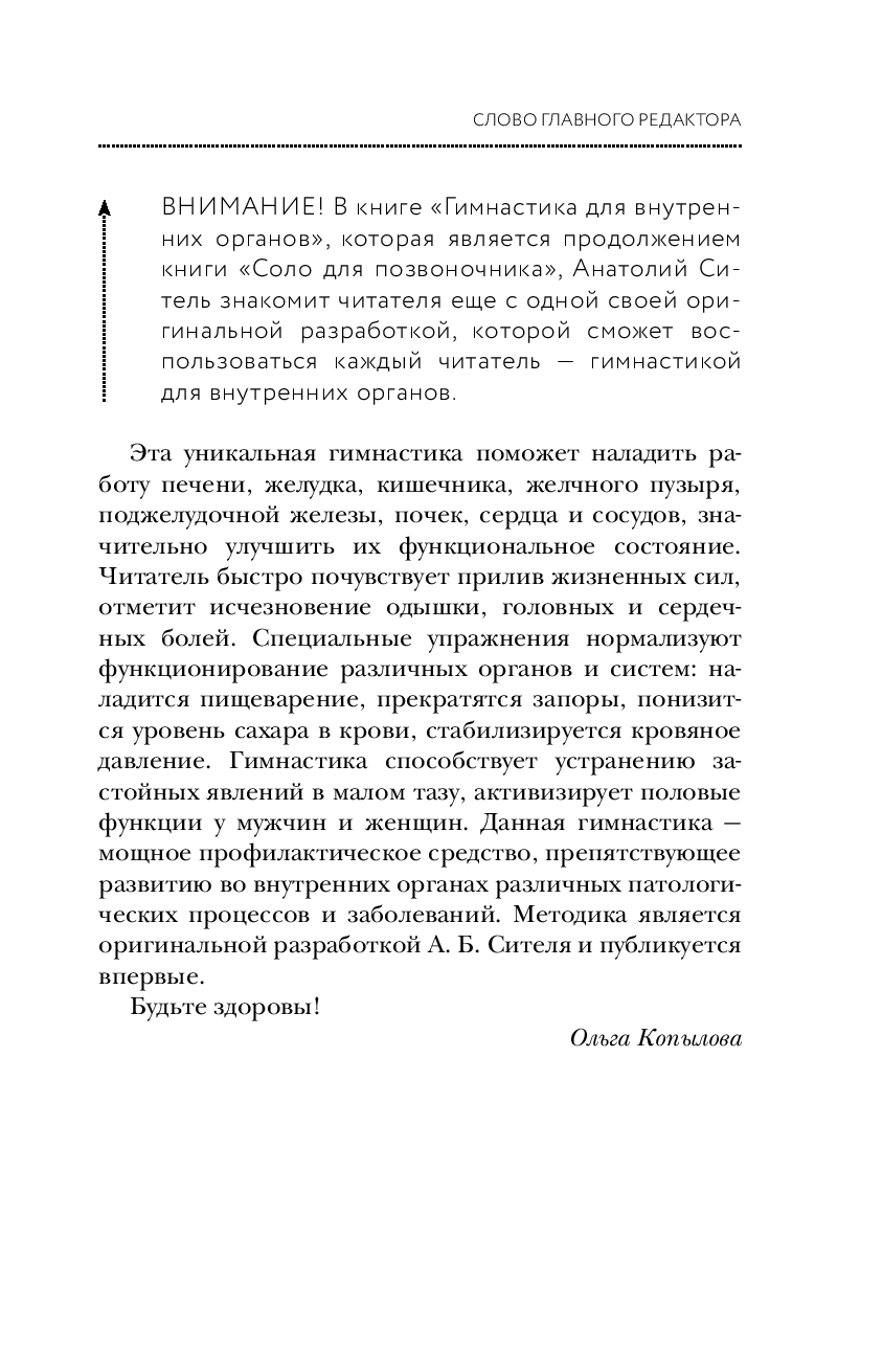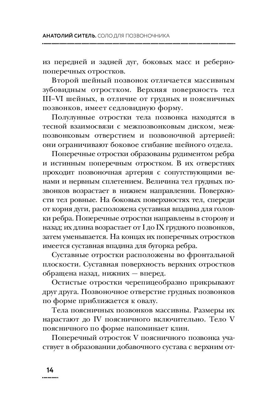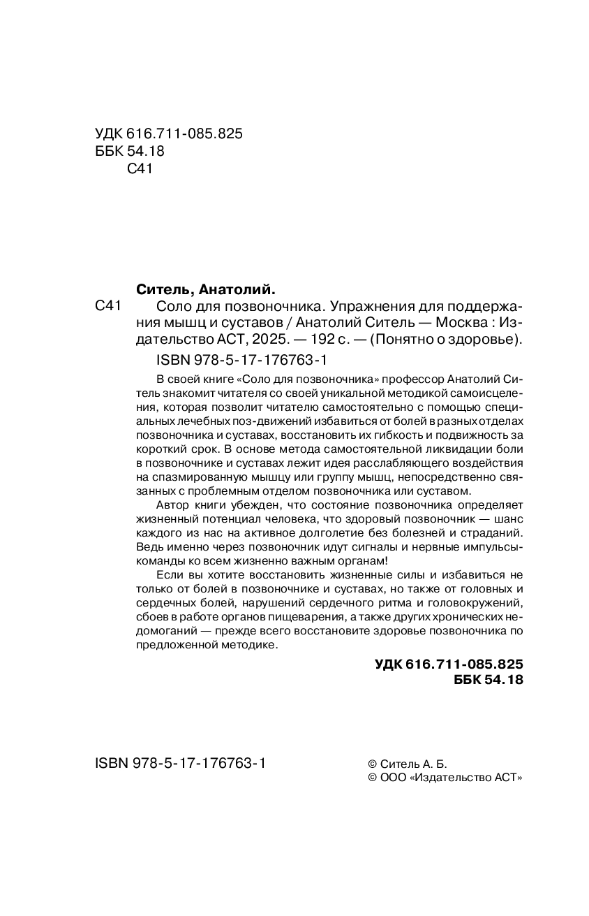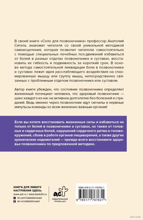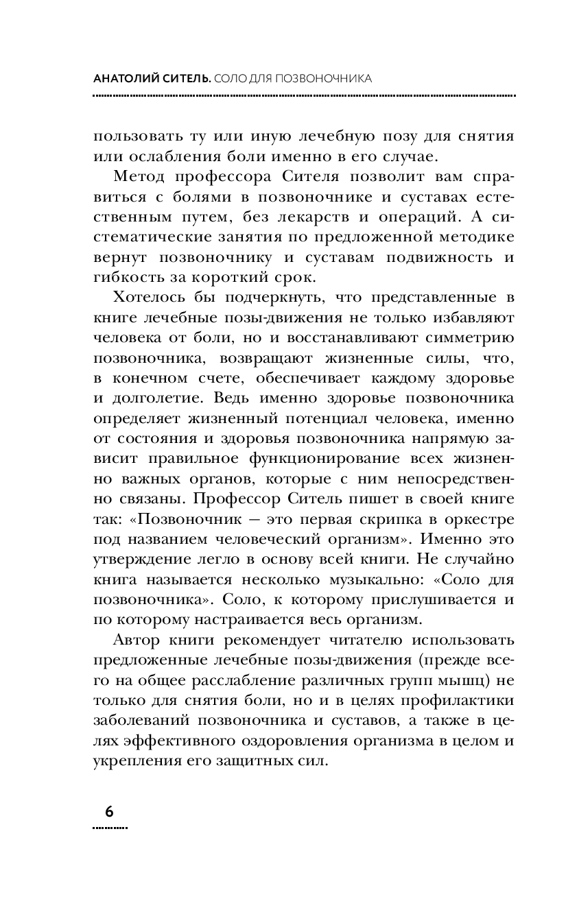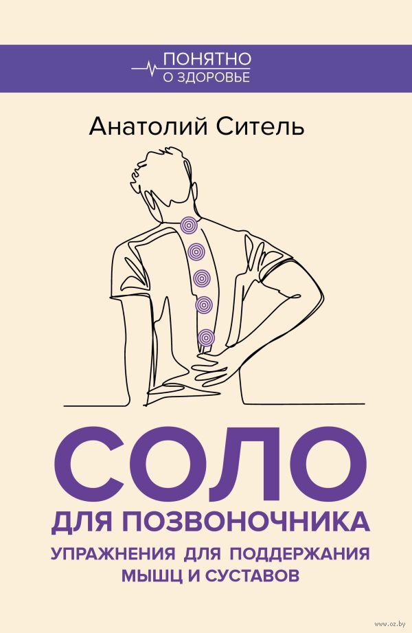 В своей книге "Соло для позвоночника" профессор Анатолий Ситель знакомит читателя со своей уникальной методикой самоисцеления, которая позволит читателю самостоятельно с помощью специальных лечебных поз-движений избавиться от болей в разных отделах позвоночника и суставах, восстановить их гибкость и подвижность за короткий срок. В основе метода самостоятельной ликвидации боли в позвоночнике и суставах лежит идея расслабляющего воздействия на спазмированную мышцу или группу мышц, непосредственно связанных с проблемным отделом позвоночника или суставом.