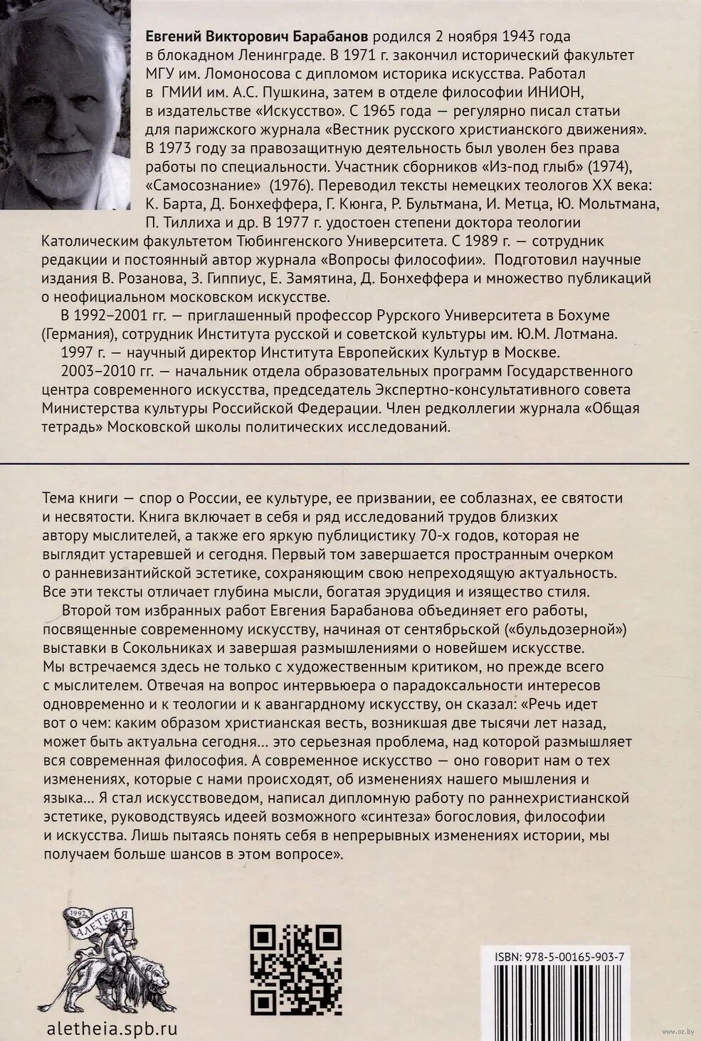 Книга включает в себя и ряд исследований трудов близких автору мыслителей, а также его яркую публицистику 70-х годов, которая не выглядит устаревшей и сегодня. Первый том завершается пространным очерком о ранневизантийской эстетике, сохраняющим свою непреходящую актуальность. Все эти тексты отличает глубина мысли, богатая эрудиция и изящество стиля.Второй том избранных работ Евгения Барабанова объединяет его работы, посвященные современному искусству, начиная от сентябрьской ("бульдозерной") выставки в Сокольниках и завершая размышлениями о новейшем искусстве. Мы встречаемся здесь не только с художественным критиком, но прежде всего с мыслителем.