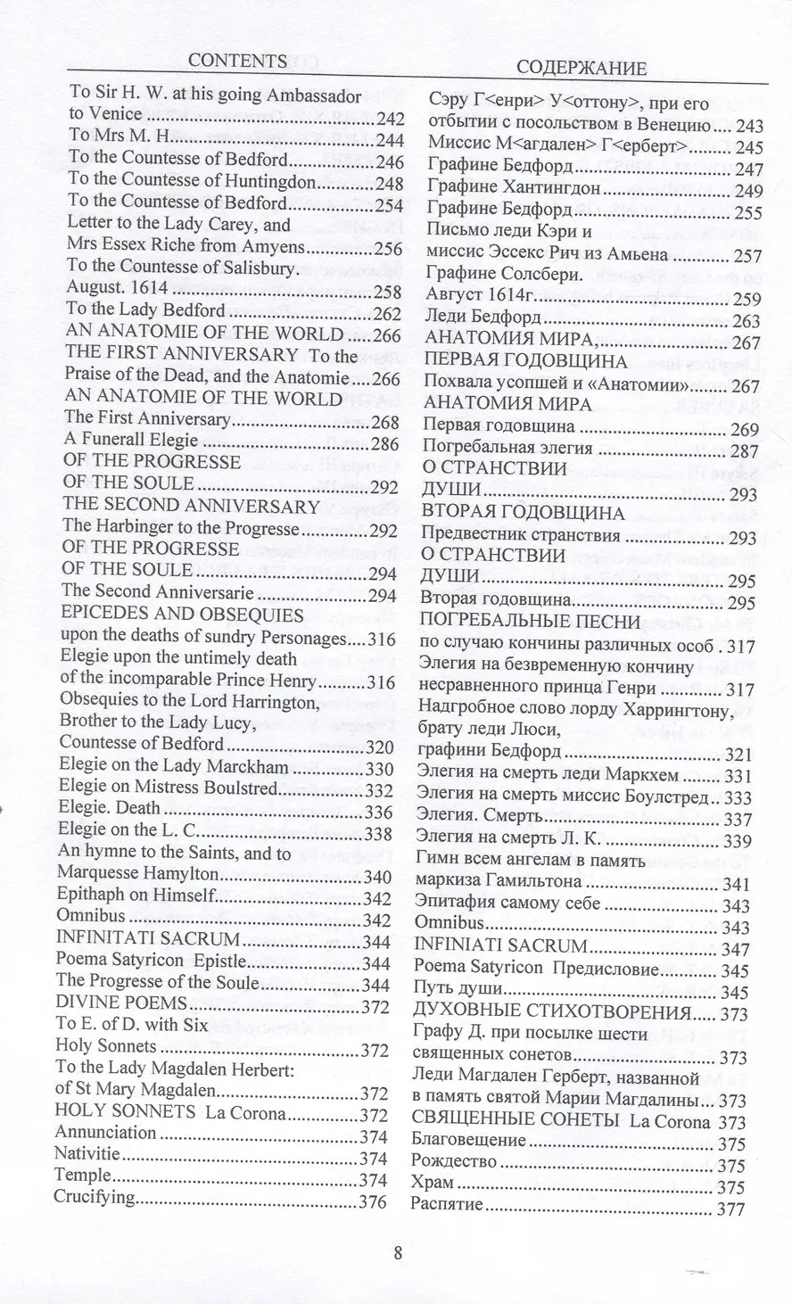 Стихи Донна неоднократно переводились на русский, но они настолько своеобразны, глубоки и необычны, что заслуживают нового прочтения и новых переводов. Собрание переводов С. Сапожникова охватывает весь корпус поэзии Донна и снабжено обширными комментариями.