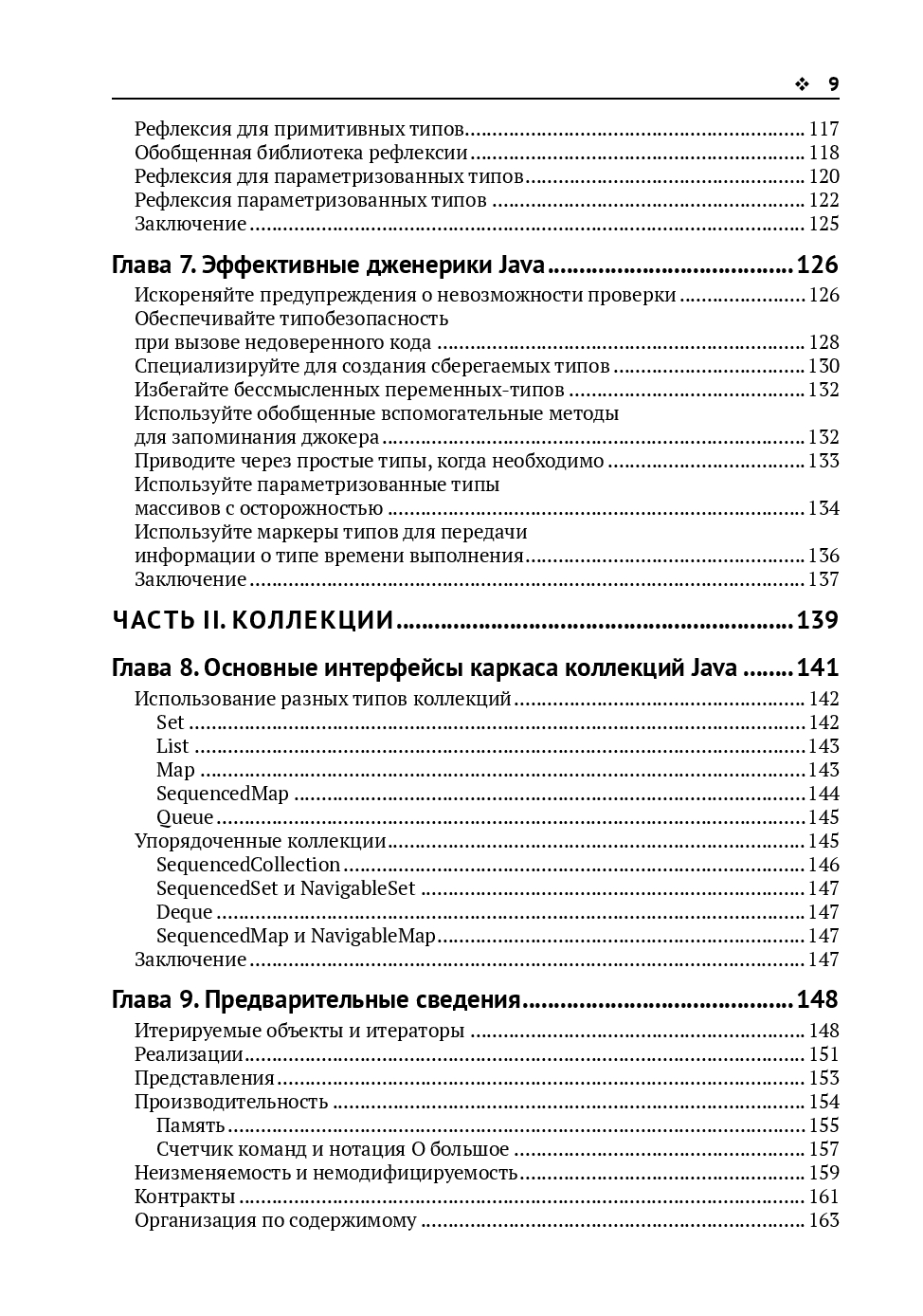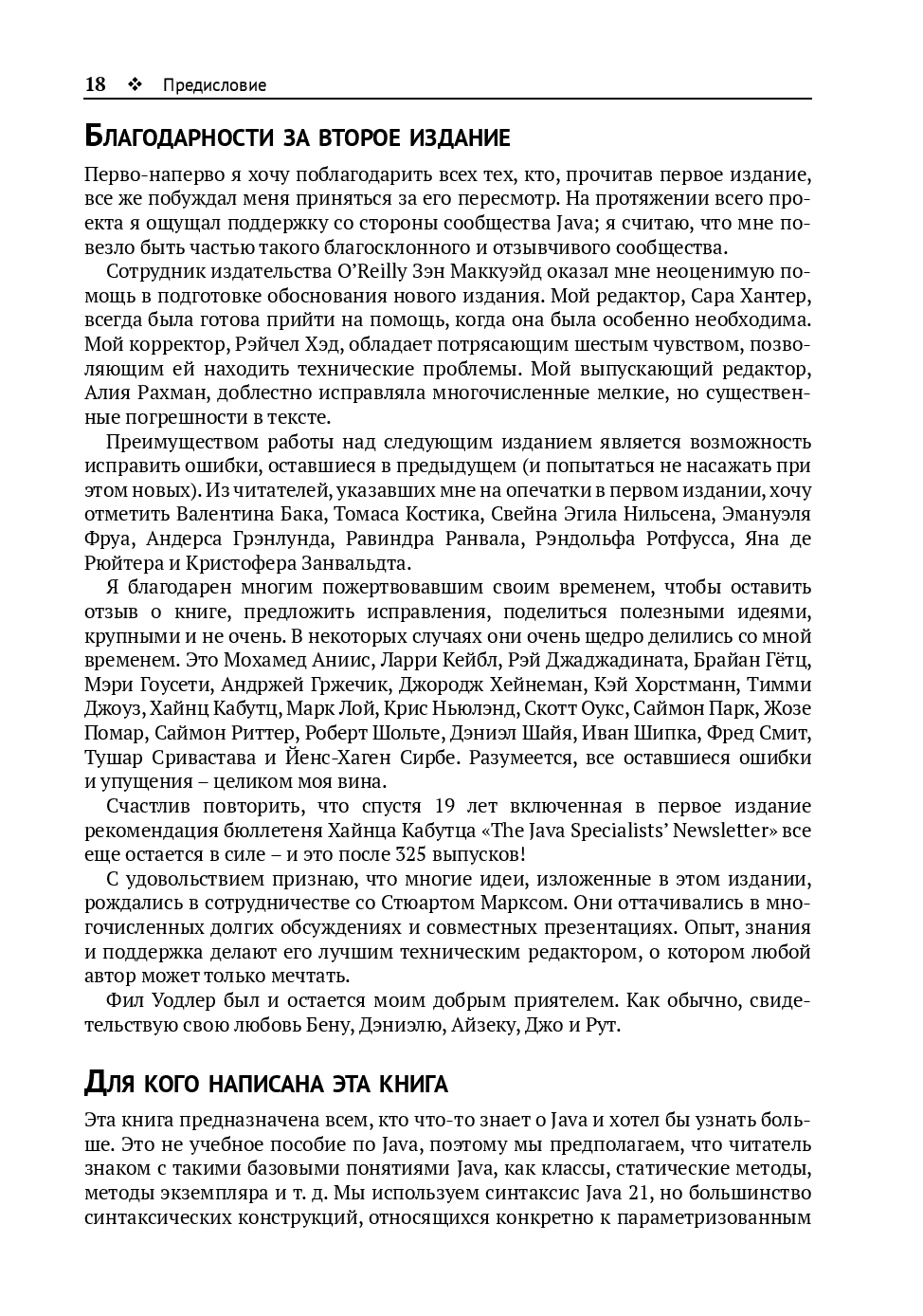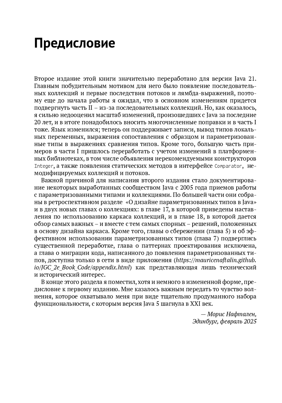Это обновленное издание самого известного за последнее десятилетие руководства охватывает Java 21 и содержит актуальную и точную информацию о работе с параметризованными типами (дженериками) и коллекциями. Вы узнаете все необходимое для эффективного использования и написания параметризованных API. В книге подробно рассматривается библиотека коллекций, чтобы вы всегда знали, какую коллекцию применять для решения стоящей перед вами задачи. Проводится сравнение потоков и коллекций, рассмотрен выбор оптимальной модели. Это поможет получить максимум пользы от платформенной библиотеки.