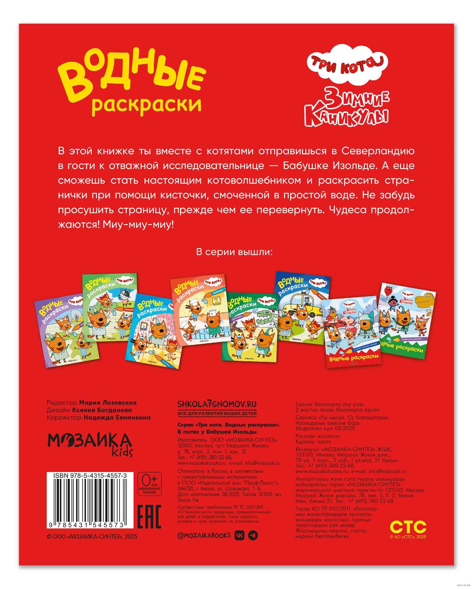 С книжкой "В гостях у Бабушки Изольды" из серии "Три кота. Водные раскраски" ребенок весело проведет время вместе с любимыми героями полнометражного мультфильма "Три кота. Зимние каникулы". А еще сможет стать настоящим котоволшебником, раскрасив странички при помощи смоченной в воде кисточки. Каждая иллюстрация очень яркая и находится на отдельном листе. Но не забывайте просушивать страницу, прежде чем ее перевернуть и приступить к следующей картинке. Водные раскраски отлично способствуют развитию творческого мышления и мелкой моторики.