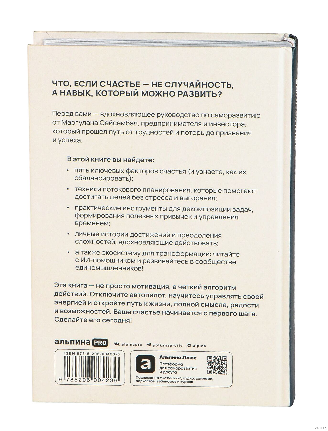 Вдохновляющее руководство по саморазвитию от Маргулана Сейсембая, предпринимателя и инвестора, который прошёл путь от трудностей и потерь до признания и успеха. В книге автор делится личным опытом преодоления кризисов и триумфов, доказывая: счастье – это не случайность и не подарок судьбы, а навык, который можно развить с помощью ясной и проверенной технологии.