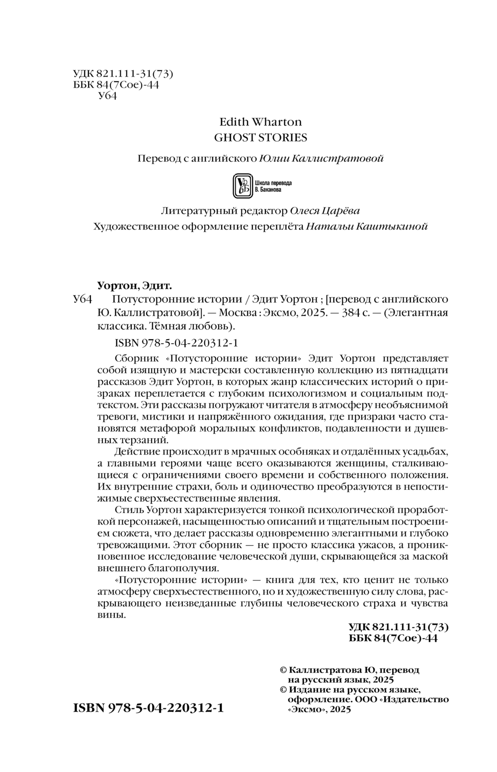 Сборник "Потусторонние истории" Эдит Уортон представляет собой изящную и мастерски составленную коллекцию из пятнадцати рассказов Эдит Уортон, в которых жанр классических историй о призраках переплетается с глубоким психологизмом и социальным подтекстом. Эти рассказы погружают читателя в атмосферу необъяснимой тревоги, мистики и напряжённого ожидания, где призраки часто становятся метафорой моральных конфликтов, подавленности и душевных терзаний.