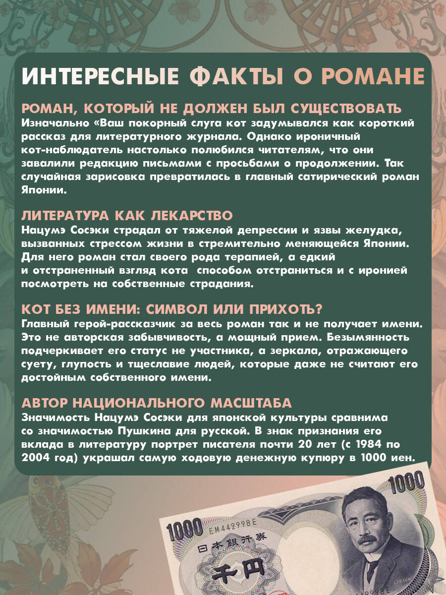 Готовьтесь взглянуть на японское общество начала XX века глазами... кота! Безымянный наблюдатель, бывший уличный бродяга, а ныне ученый и домашний питомец, с саркастичным юмором наблюдает за жизнью своего хозяина-интеллигента и его гостей.