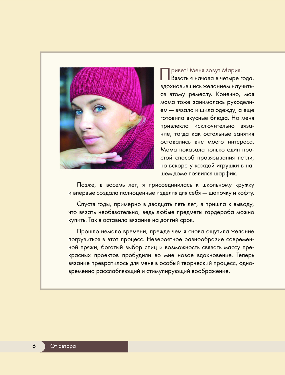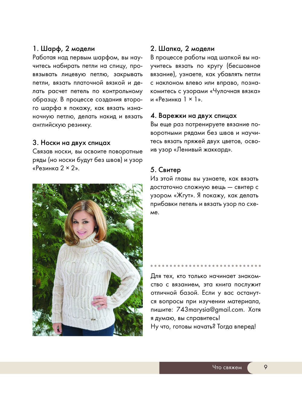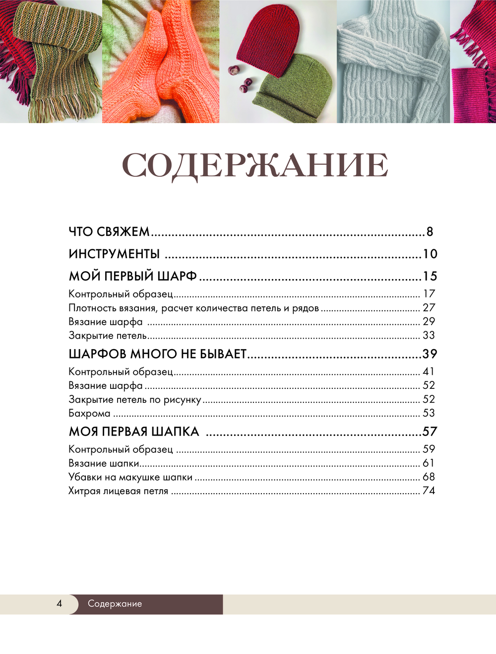 Мария Закржевская предлагает начать сразу с практики: взять в руки спицы и погрузиться в вязание с головой, не тратя время на упражнения. Вы свяжете шарф, шапку, носки, варежки и даже свитер, по ходу освоив все необходимые приемы и техники.