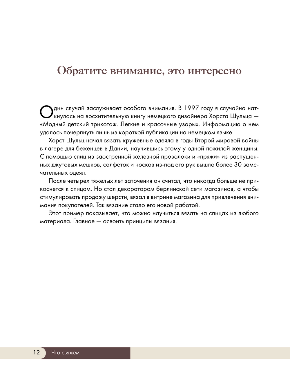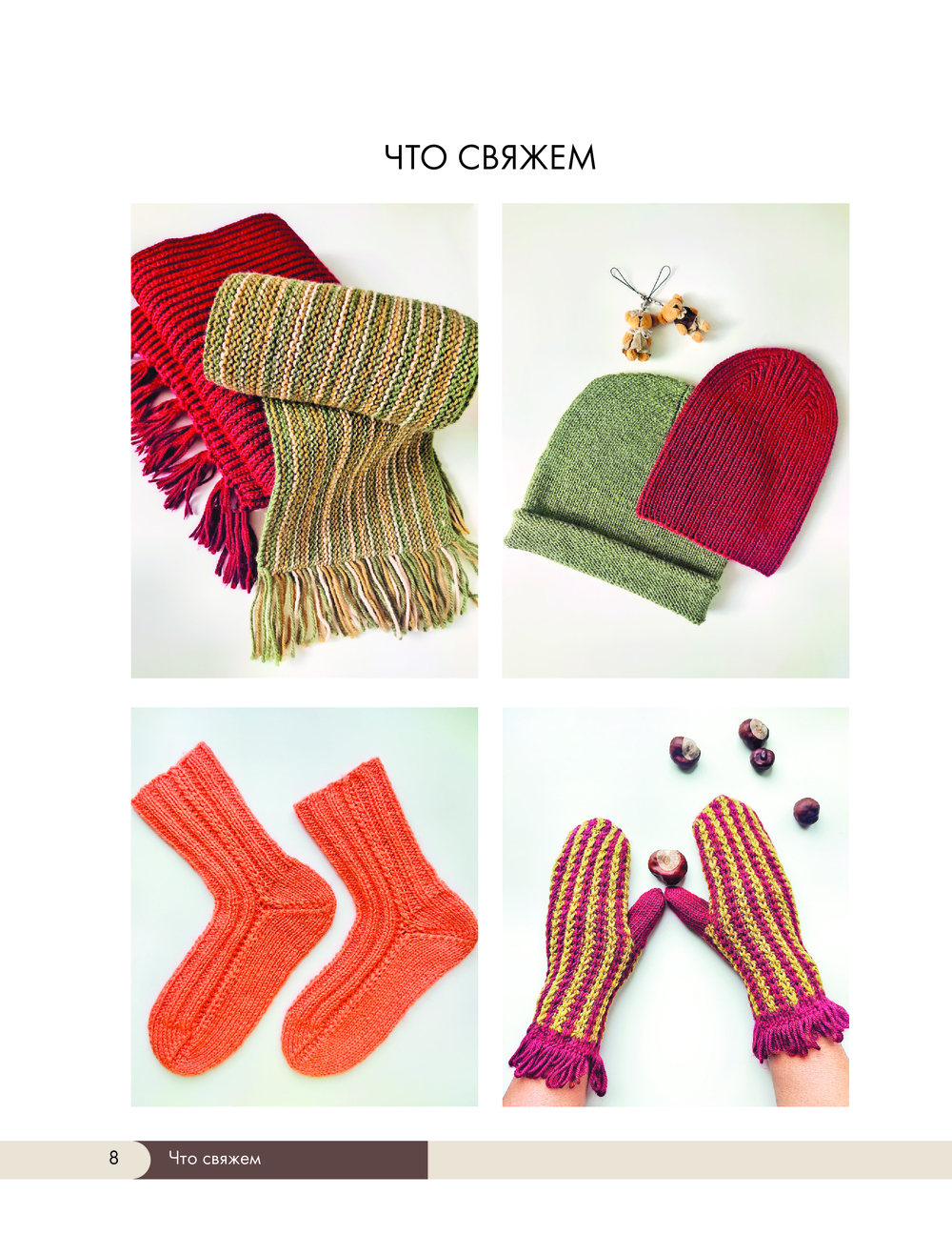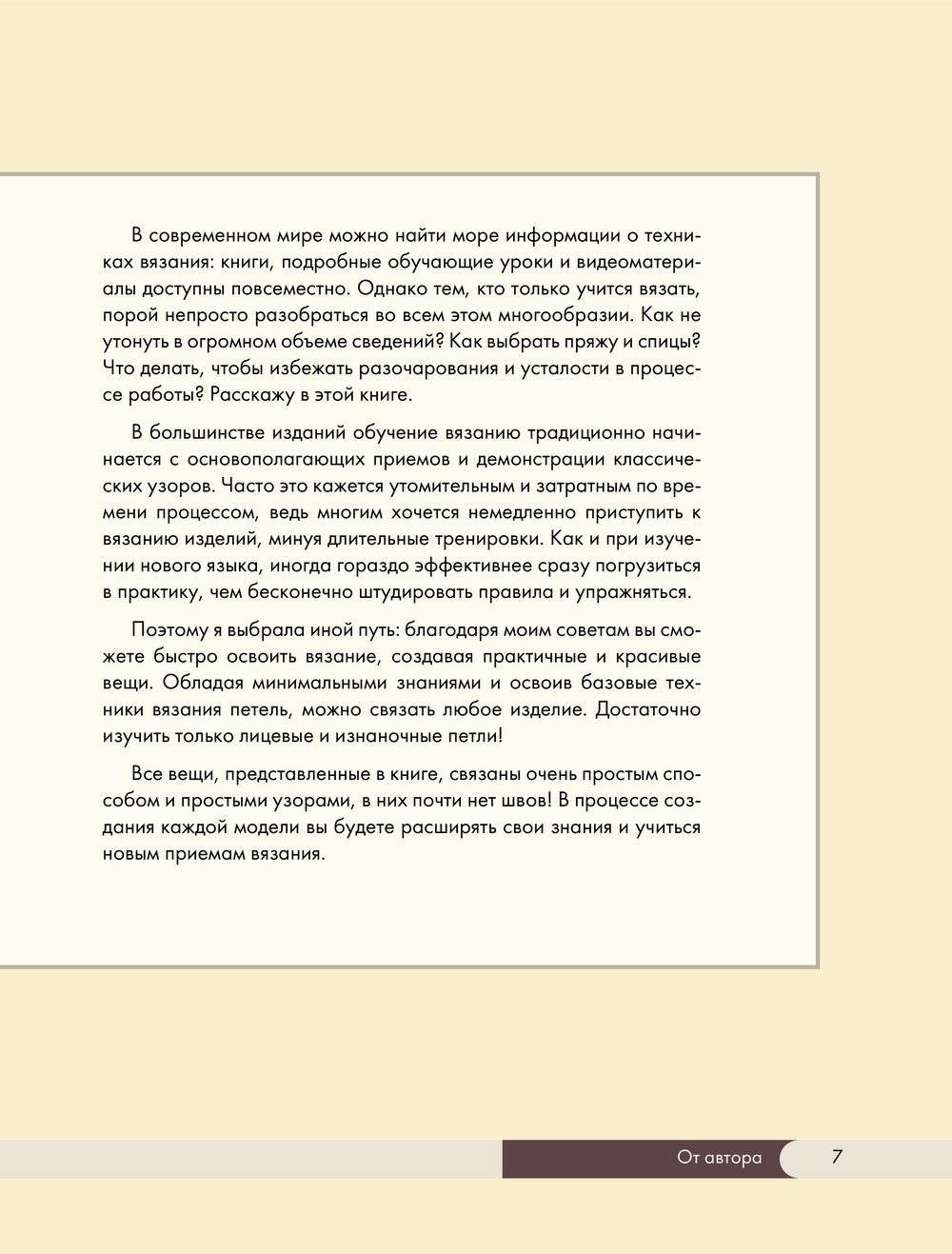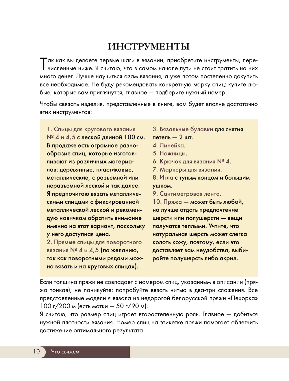 Мария Закржевская предлагает начать сразу с практики: взять в руки спицы и погрузиться в вязание с головой, не тратя время на упражнения. Вы свяжете шарф, шапку, носки, варежки и даже свитер, по ходу освоив все необходимые приемы и техники.