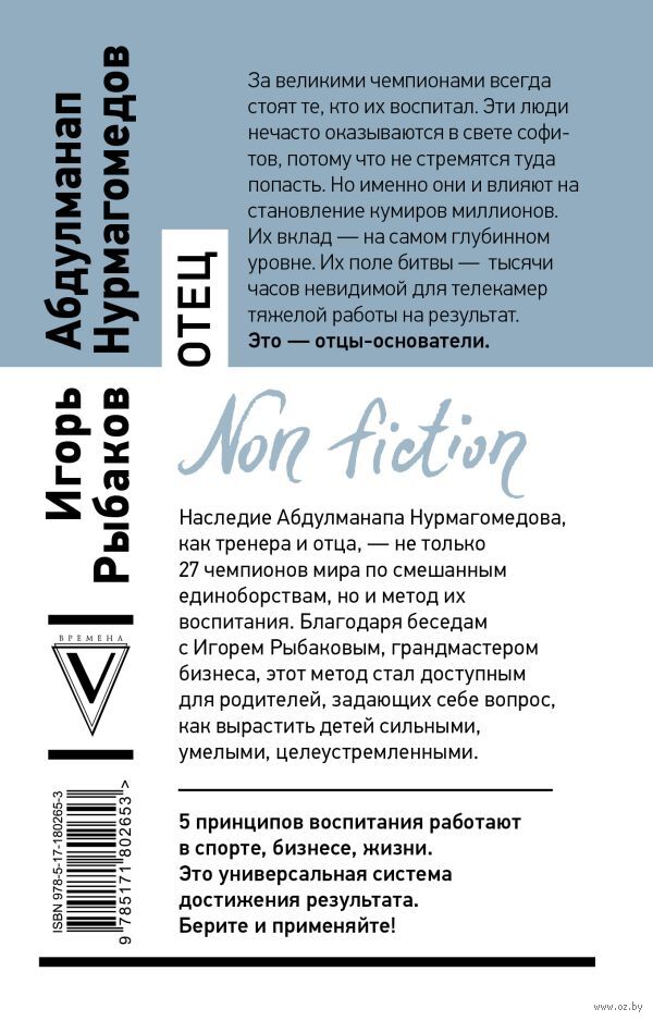 Игорь Рыбаков и Абдулманап Нурмагомедов имеют много общего. Каждый стал мировым лидером в том, что делает. Оба долгие годы посвятили развитию – себя, проектов, бизнесов, сотрудников – и детей. И теперь вы держите в руках первую совместную работу двух гранд-мастеров – книгу, посвященную воспитанию. Воспитанию чемпионов в спорте, бизнесе и жизни. Под обложкой 5 авторских принципов, которые вместе образуют универсальную систему достижения результата. Примерьте ее на себя прямо сейчас!