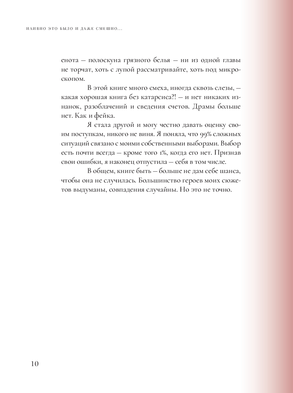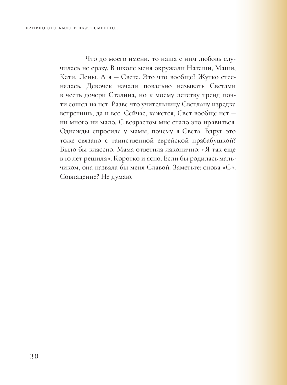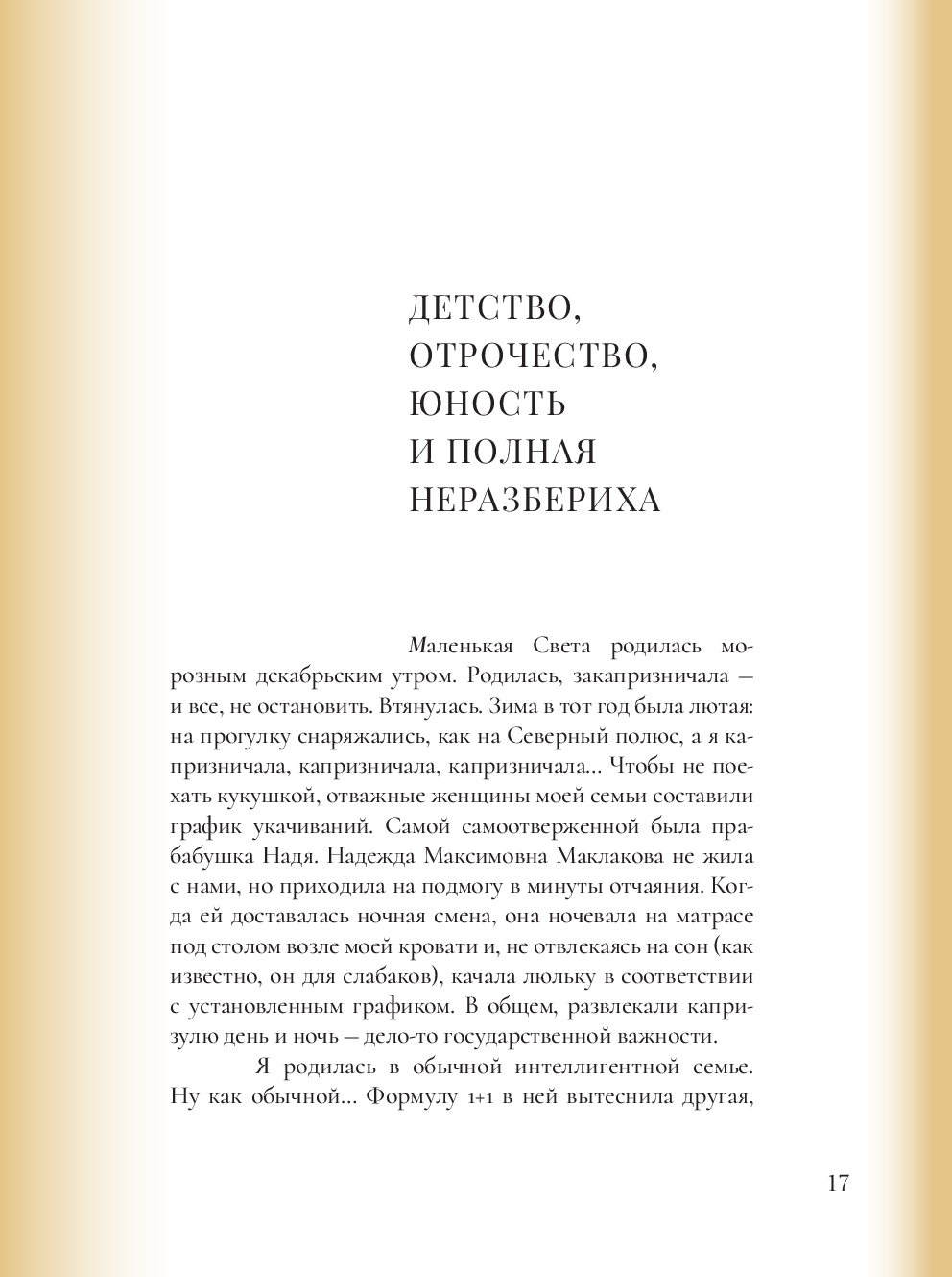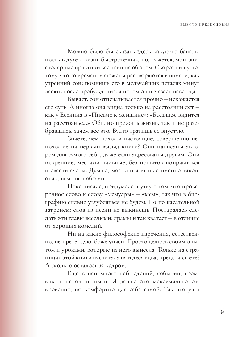 Откровенная и ироничная исповедь Светланы Бондарчук. Это не мемуары в классическом смысле, а собрание жизненных историй, наблюдений и уроков. Книга о том, как не бояться перемен, принимать ошибки и находить себя после всего. Без сожалений и обид. С самоиронией, благодарностью и светом. Светлана пишет о детстве, семье, любви, дружбе, разводе, взрослении и силе честности. Это рассказ женщины, которая познала боль и сохранила главное: достоинство, чувство юмора и здравый взгляд на жизнь.