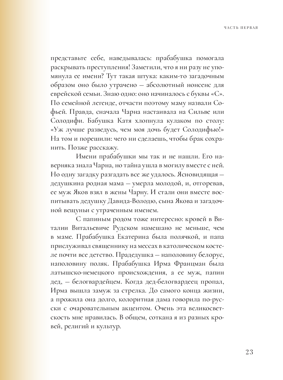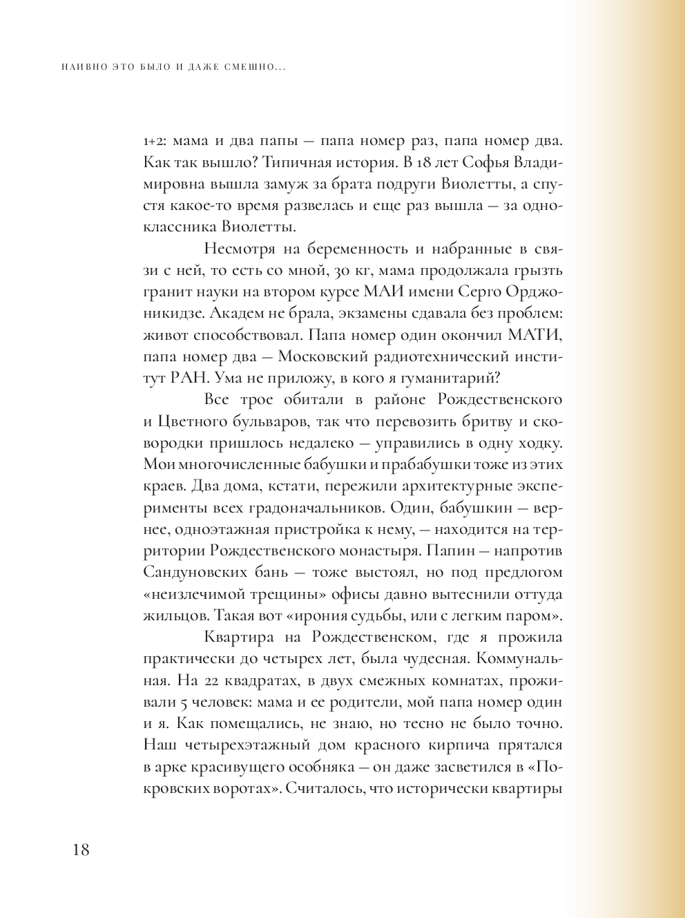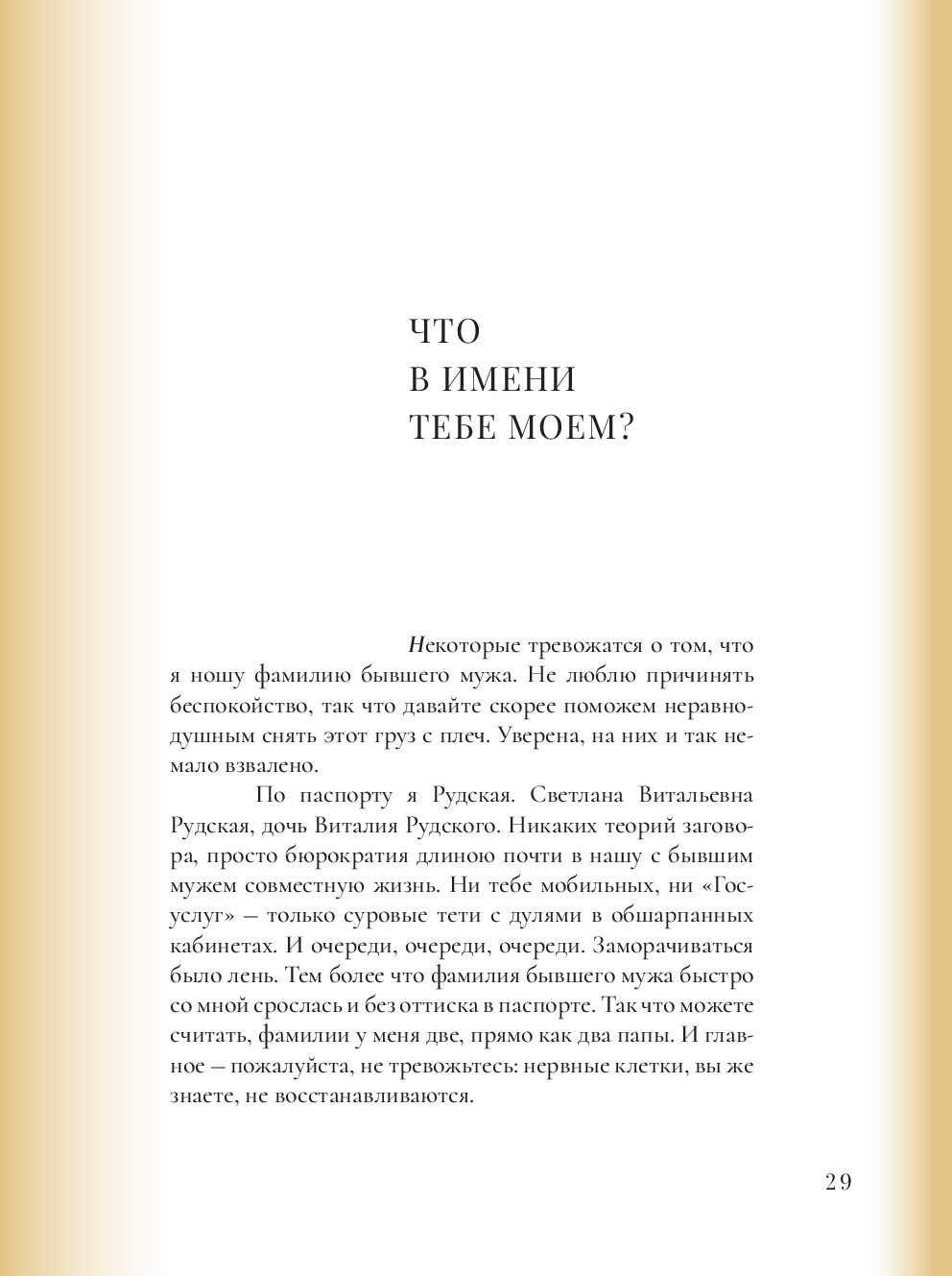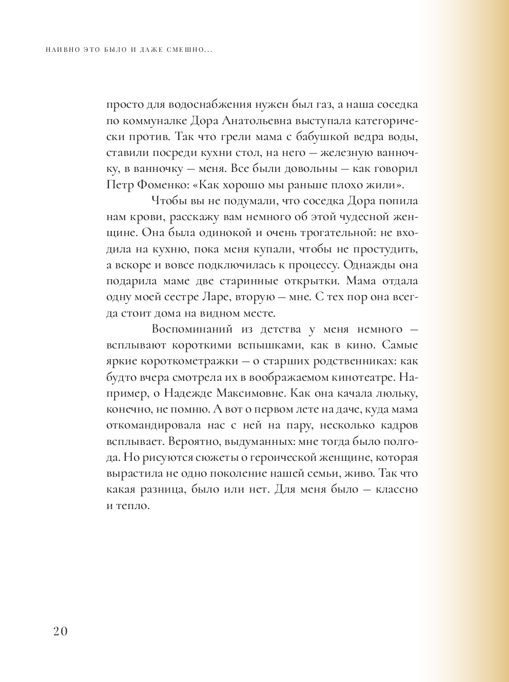 Откровенная и ироничная исповедь Светланы Бондарчук. Это не мемуары в классическом смысле, а собрание жизненных историй, наблюдений и уроков. Книга о том, как не бояться перемен, принимать ошибки и находить себя после всего. Без сожалений и обид. С самоиронией, благодарностью и светом. Светлана пишет о детстве, семье, любви, дружбе, разводе, взрослении и силе честности. Это рассказ женщины, которая познала боль и сохранила главное: достоинство, чувство юмора и здравый взгляд на жизнь.