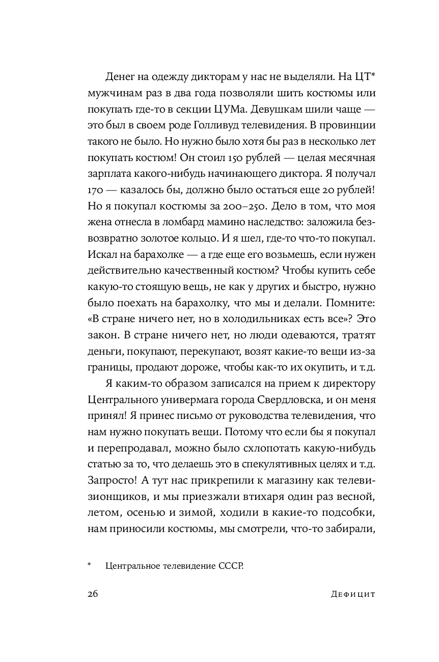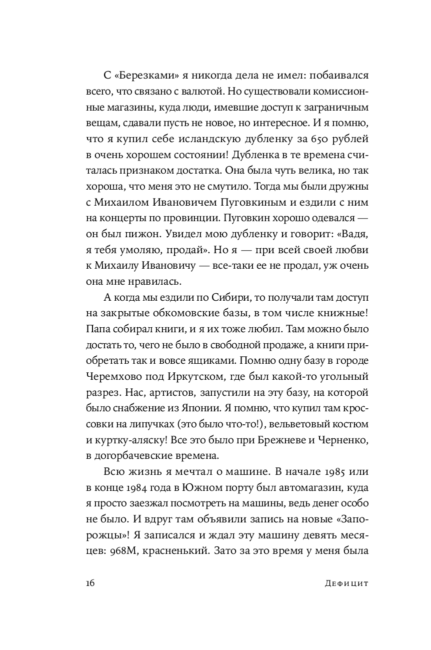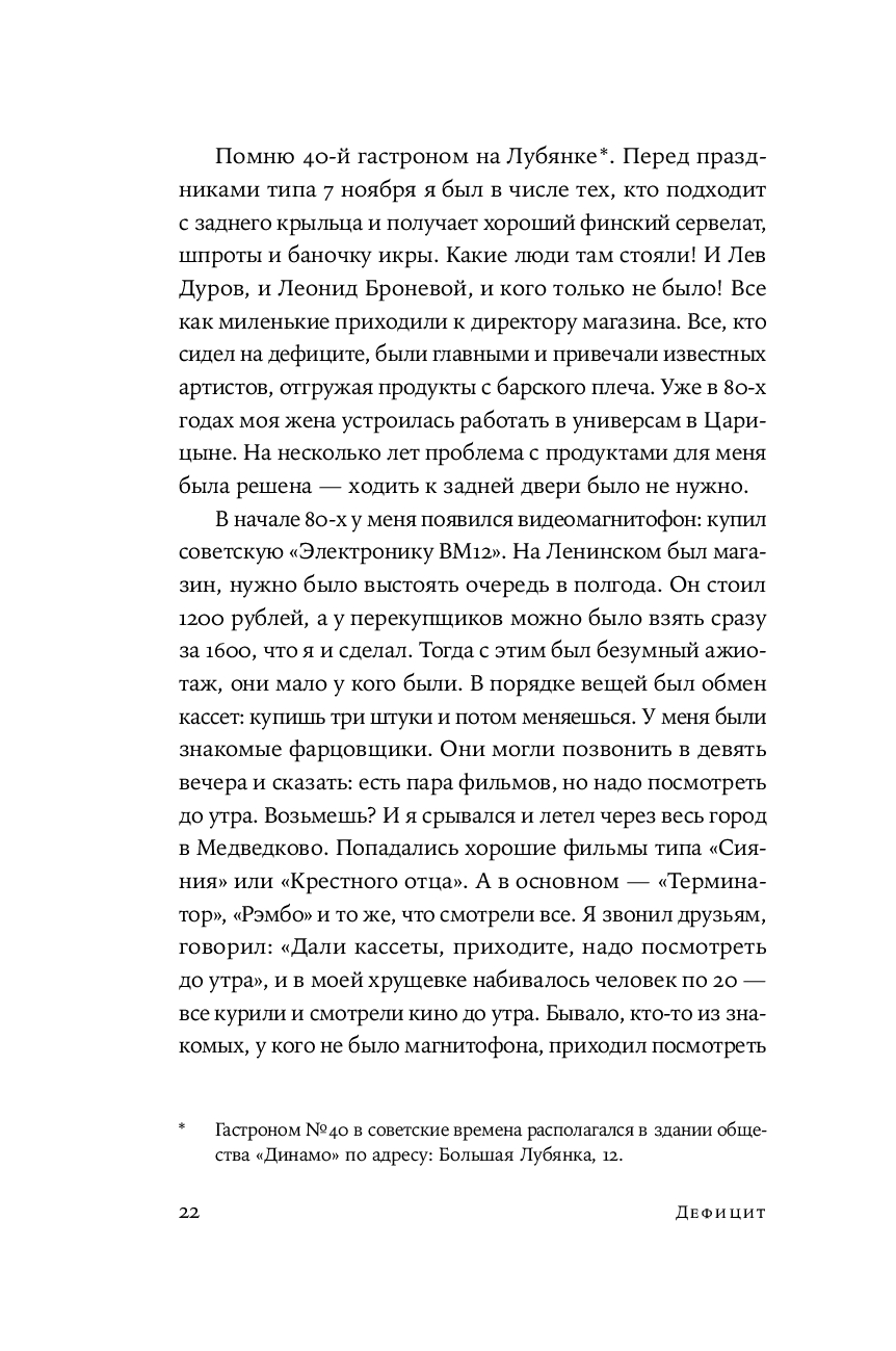 Сборник историй великих российских артистов, режиссеров и актеров об интереснейшем явлении в истории СССР – дефиците. Эта книга не только о том, на какие ухищрения шли люди, чтобы раздобыть самое необходимое – одежду и обувь, продукты, бытовую технику, книги, машины, билеты в театр и контакты нужных специалистов (врачей, сантехников, автослесарей) – она о самом времени и обстоятельствах, которые так или иначе коснулись почти каждого жителя страны. Это памятник ушедшей эпохе и подтверждение тому, что советский человек мог найти выход практически из любого положения и не поддавался унынию, и умел радоваться не только огромным победам, но и самым простым вещам.