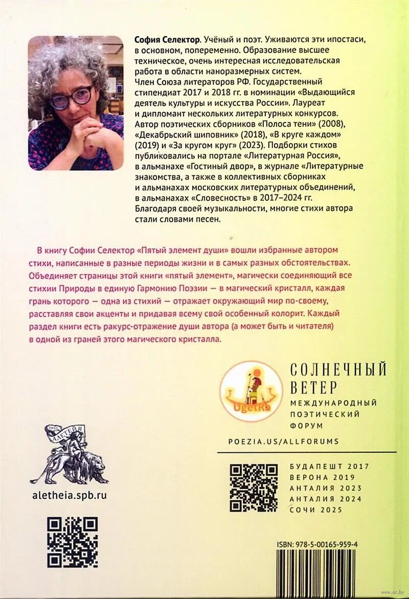 В книгу Софии Селектор "Пять ракурсов души" вошли избранные автором стихи, написанные в разные периоды жизни и в самых разных обстоятельствах. Объединяет страницы этой книги магический кристалл Поэзии, каждая грань которого – одна из стихий Природы – отражает окружающий мир по-своему, расставляя свои акценты и придавая ему свой особенный колорит. Каждый раздел книги есть ракурс-отражение души автора (а может быть и читателя) в одной из граней этого магического кристалла.