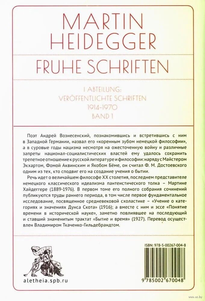 Речь идет о величайшем философе XX столетия, последнем представителе немецкого классического идеализма пантеистического толка – Мартине Хайдеггере (1889-1976). В первом томе его полного собрания сочинений публикуются труды раннего периода, в том числе первое фундаментальное исследование, посвященное средневековой схоластике – "Учение о категориях и значениях Дунса Скота" (1916); а вместе с ним и эссе "Понятие времени в исторической науке", заметно повлиявшее на последующий и ставший знаменитым трактат "Бытие и время" (1927).