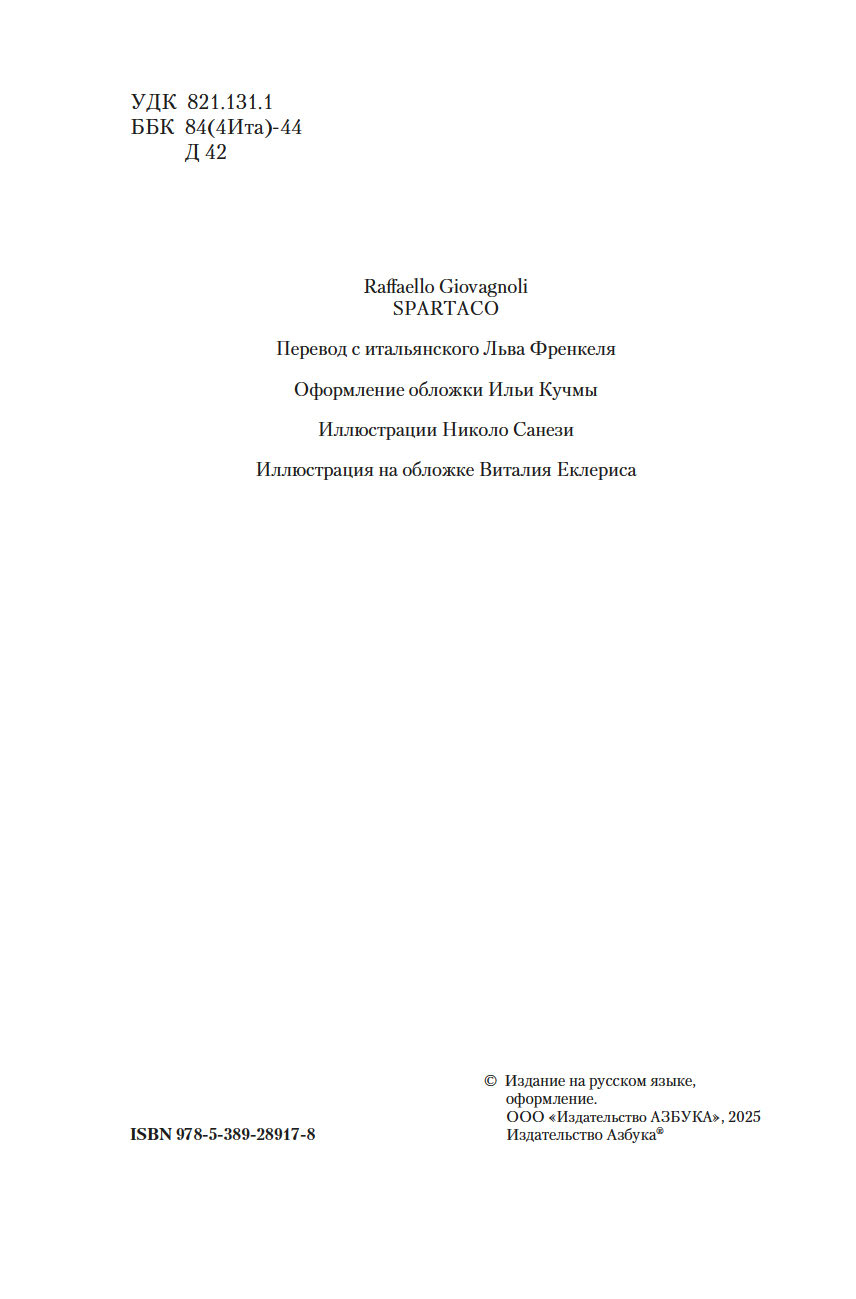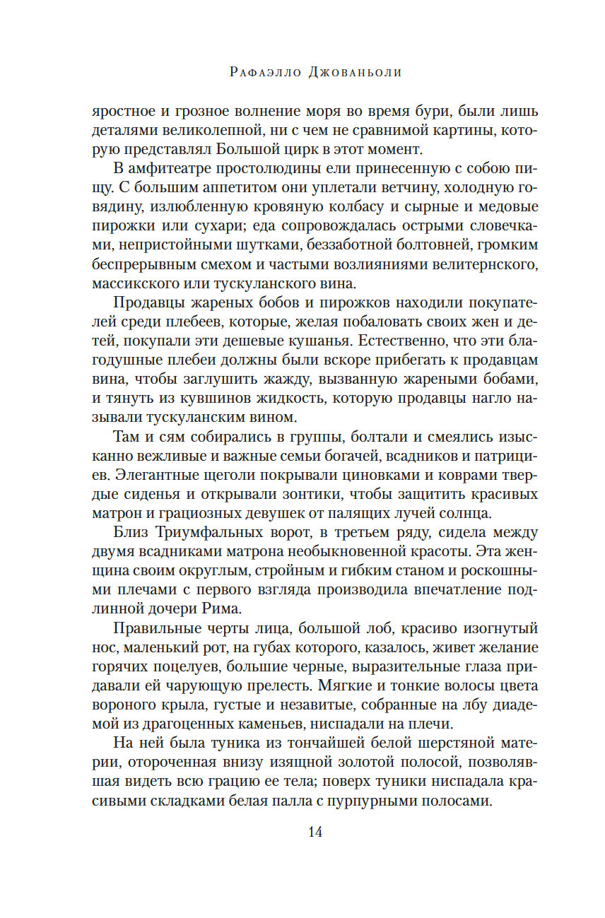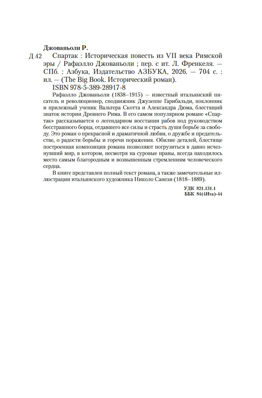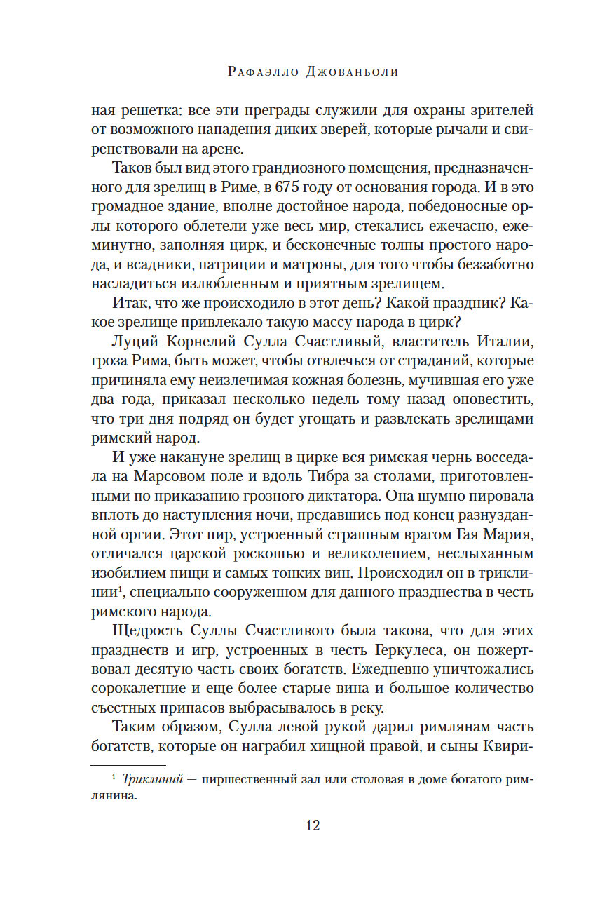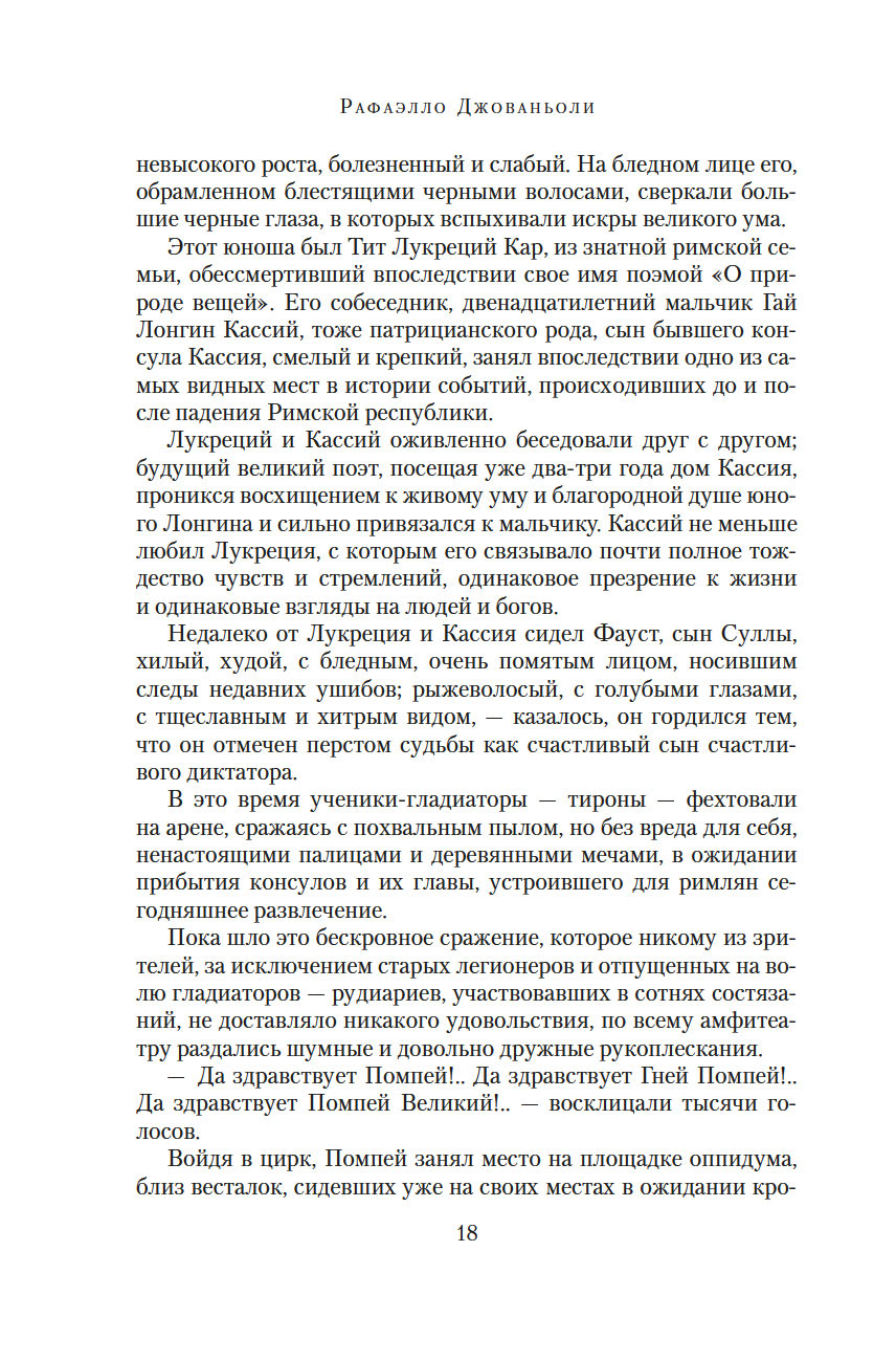 Рафаэлло Джованьоли (1838-1915) – известный итальянский писатель и революционер, сподвижник Джузеппе Гарибальди, поклонник и прилежный ученик Вальтера Скотта и Александра Дюма, блестящий знаток истории Древнего Рима. В его самом популярном романе "Спартак" рассказывается о легендарном восстании рабов под руководством бесстрашного борца, отдавшего все силы и страсть души борьбе за свободу. Это роман о прекрасной и драматичной любви, о дружбе и предательстве, о радости борьбы и горечи поражения. Обилие деталей, блестяще построенная композиция романа позволяют погрузиться в давно исчезнувший мир, в котором, несмотря на суровые нравы, всегда находилось место самым благородным и возвышенным стремлениям человеческого сердца.