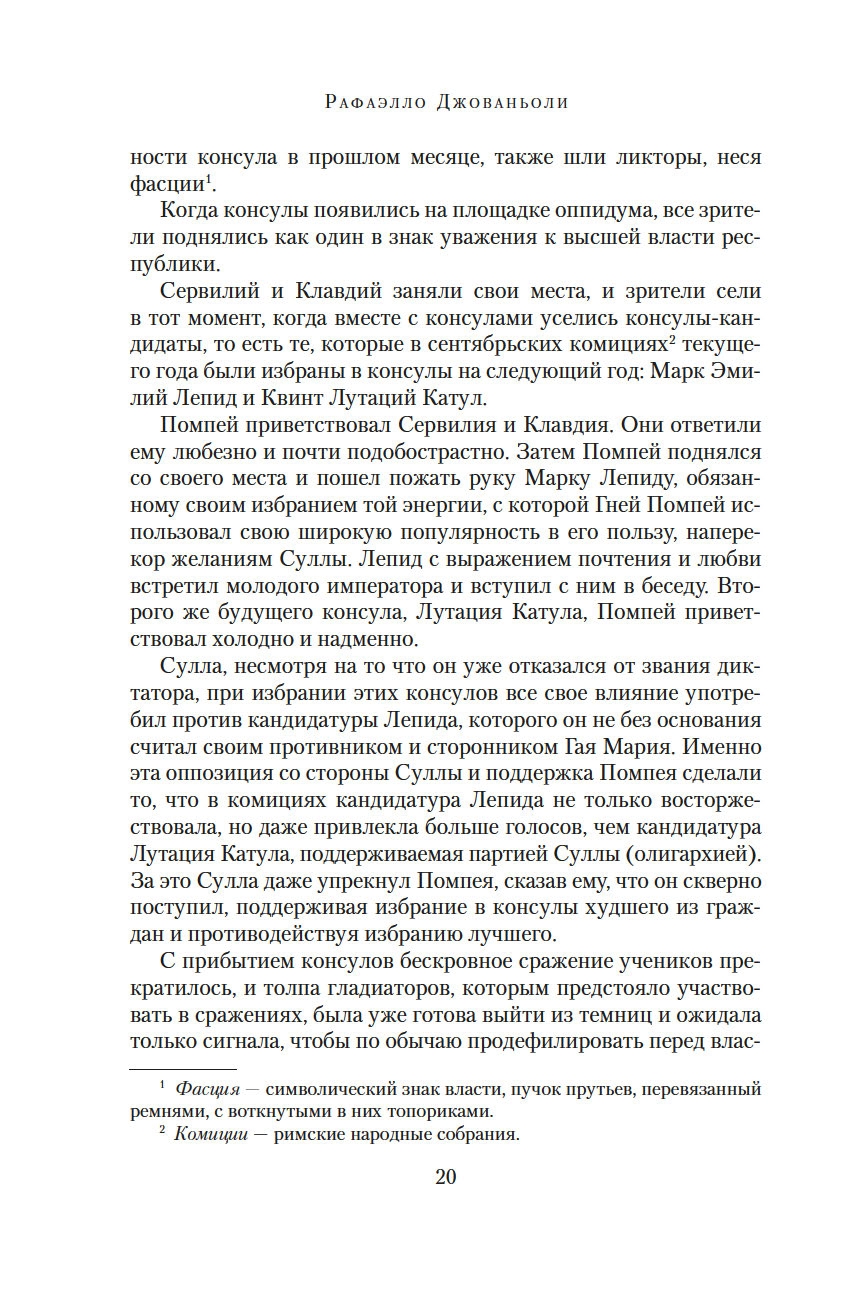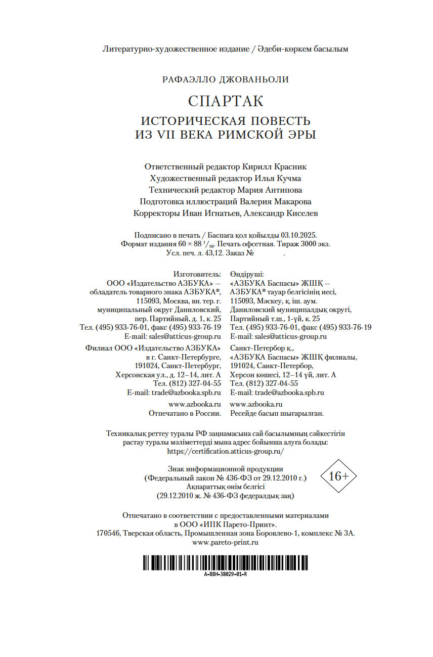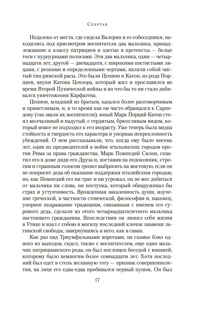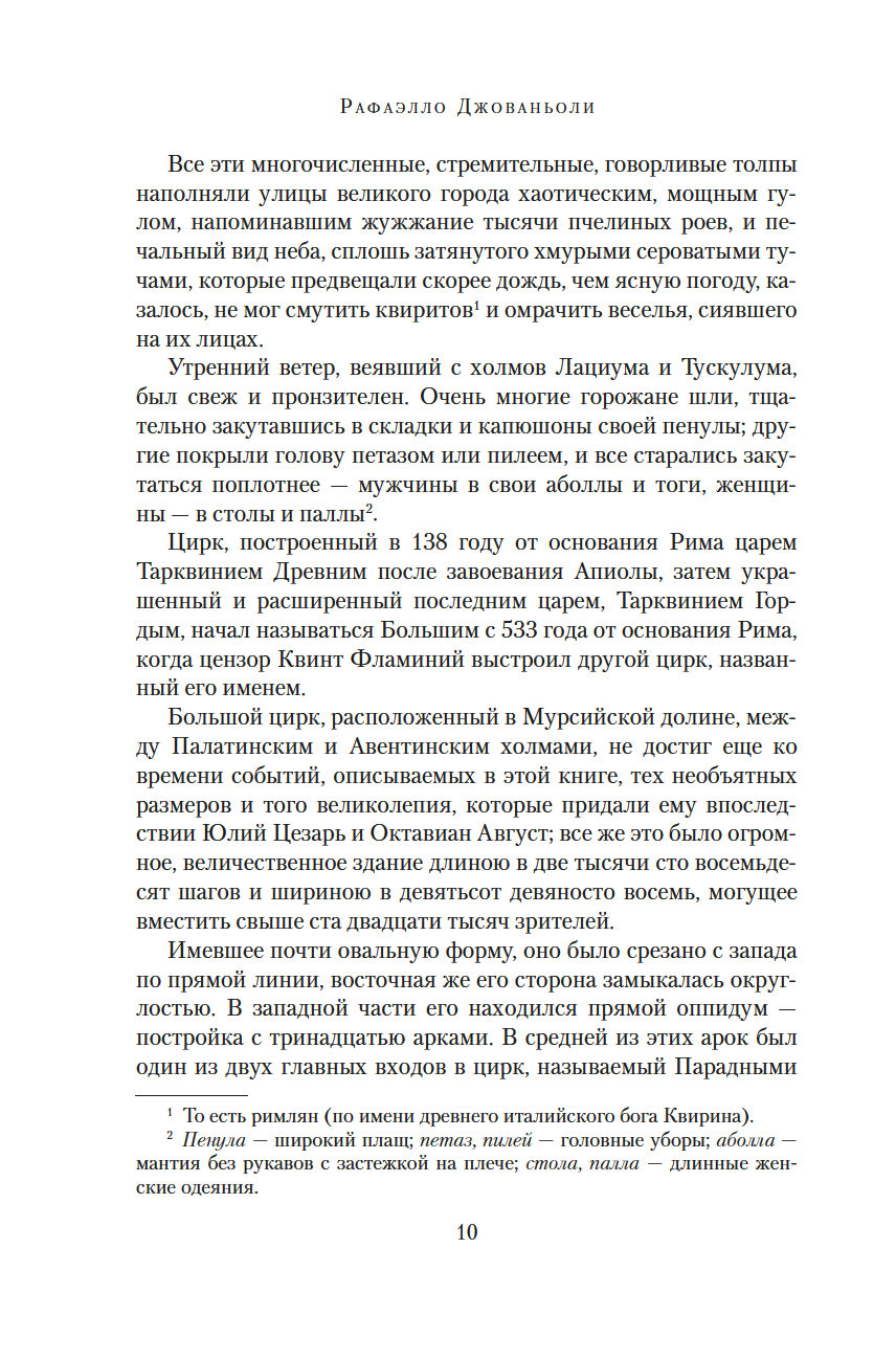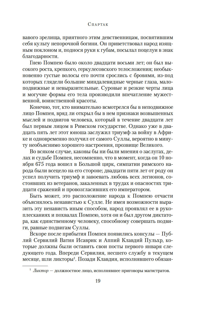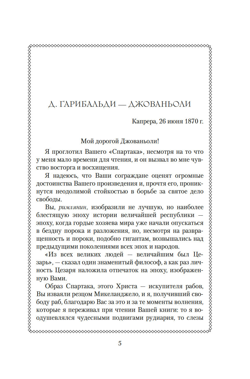Рафаэлло Джованьоли (1838-1915) – известный итальянский писатель и революционер, сподвижник Джузеппе Гарибальди, поклонник и прилежный ученик Вальтера Скотта и Александра Дюма, блестящий знаток истории Древнего Рима. В его самом популярном романе "Спартак" рассказывается о легендарном восстании рабов под руководством бесстрашного борца, отдавшего все силы и страсть души борьбе за свободу. Это роман о прекрасной и драматичной любви, о дружбе и предательстве, о радости борьбы и горечи поражения. Обилие деталей, блестяще построенная композиция романа позволяют погрузиться в давно исчезнувший мир, в котором, несмотря на суровые нравы, всегда находилось место самым благородным и возвышенным стремлениям человеческого сердца.