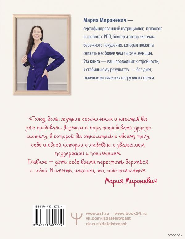Автор разработала свой метод не только на базе полученного образования, но и на основе личного опыта похудения со 120 до 65 кг.