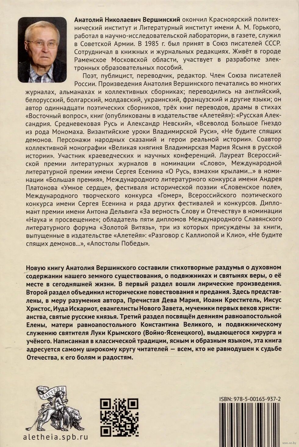 Новую книгу Анатолия Вершинского составили стихотворные раздумья о духовном содержании нашего земного существования, о подвижниках и святынях веры, о её месте в сегодняшней жизни.