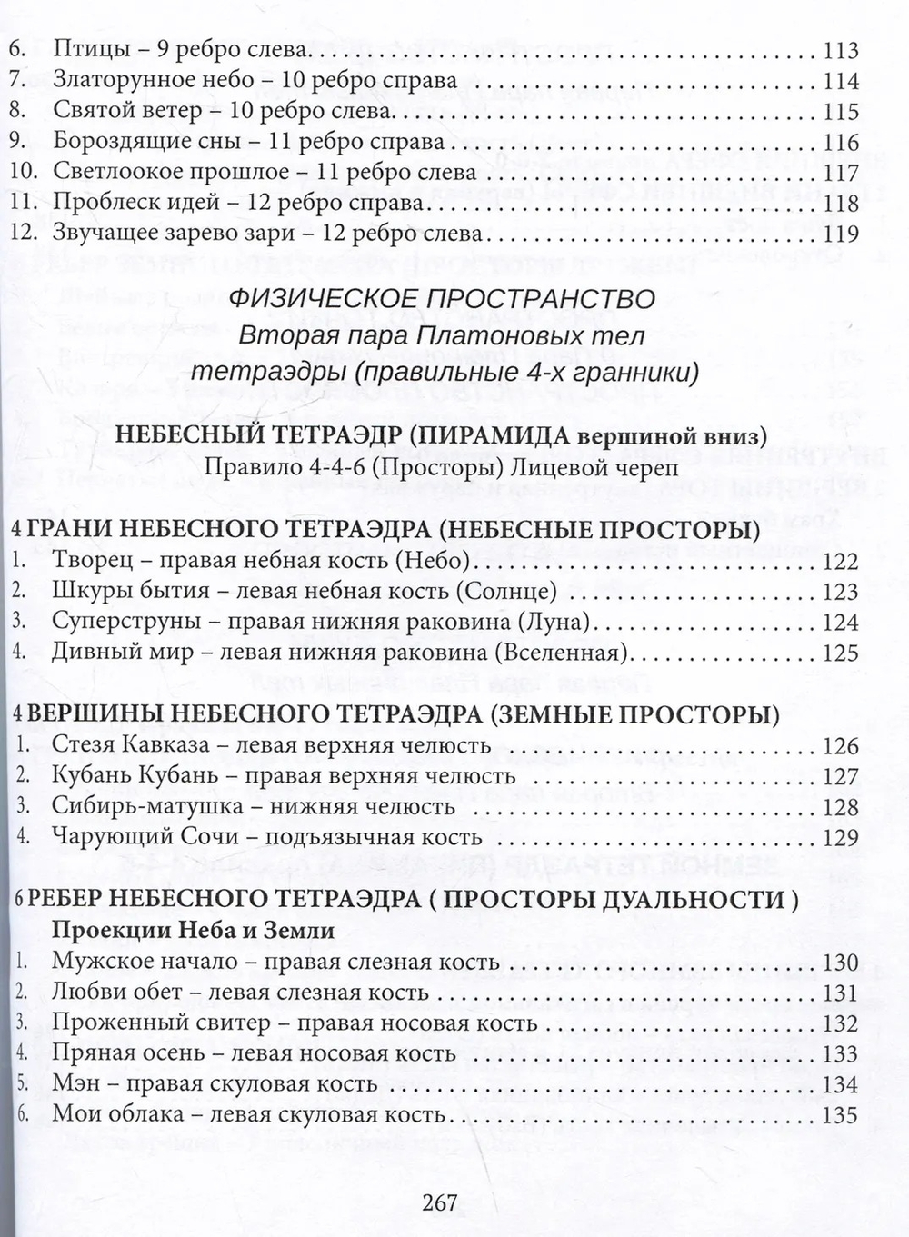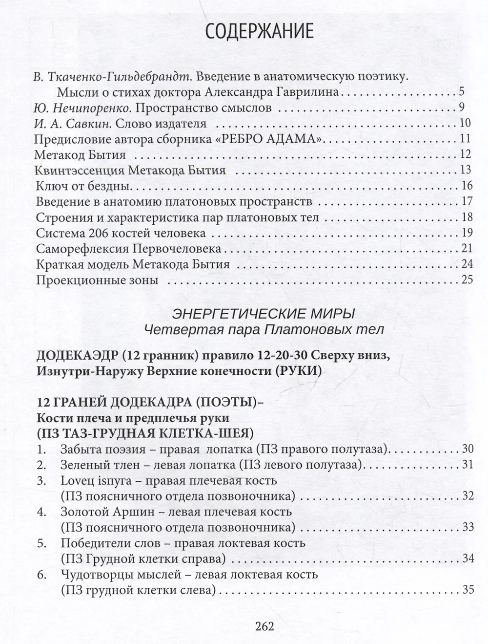 Книга представляет размышления автора при поиске закономерностей сакрального строения скелета человека, жизненных миров на основе математики Платоновых тел. Отдельные кости и характеристики Платоновых тел представлены внутренней структурой (скелетом) поэтического сборника.