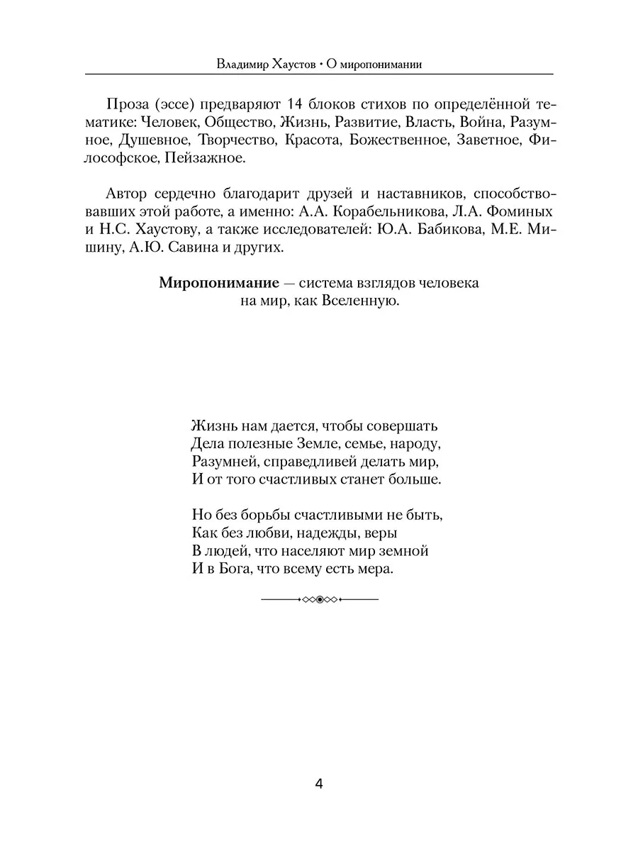 В сборник прозы и стихов Владимира Хаустова вошли произведения, посвящённые важнейшим вопросам мироздания, актуальным на все времена, а именно: человек, общество, жизнь, развитие, власть, война, разумное, душевное, творчество, красота, счастье, божественное. Представленные в различной форме тематические материалы могут способствовать повышению уровня понимания читателями объектов мироздания и протекающих в нём процессов. Тем самым автор предлагает найти единомышленников для полезной работы в интересах государства, народов России и всего человечества.