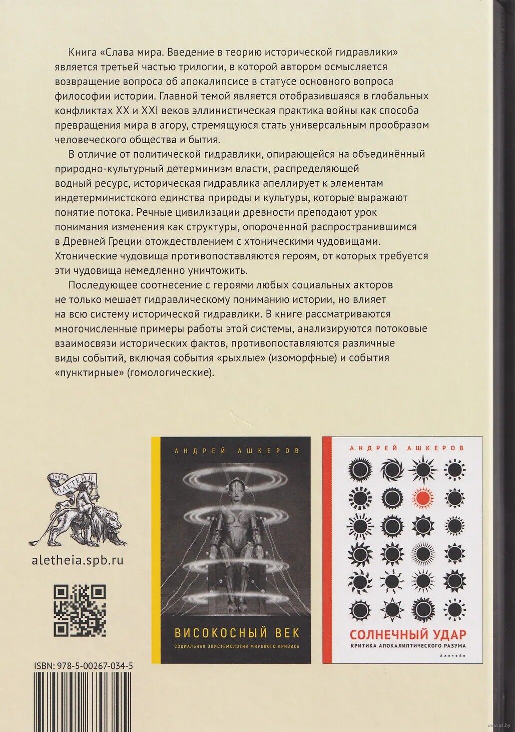 Книга "Слава мира. Введение в теорию исторической гидравлики" является третьей частью трилогии, в которой автором осмысляется возвращение вопроса об апокалипсисе в статусе основного вопроса философии истории. Главной темой третьей части является отобразившаяся в глобальных конфликтах XX и XXI веков эллинистическая практика войны как способа превращения мира в агору, стремящуюся стать универсальным прообразом человеческого общества и бытия.