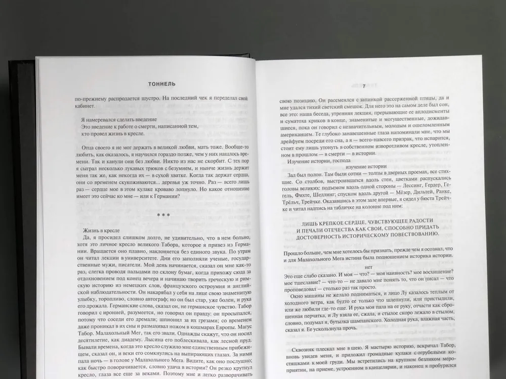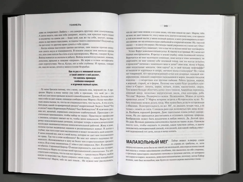 Текст безжалостно погружает читателя в самые глубокие закоулки человеческой души, раскрываясь как эпатирующий философский роман идей, где автор высказывает неудобные истины и размышляет на темы природы истории, фанатизма, веры, иллюзий и фикций человеческого сознания.