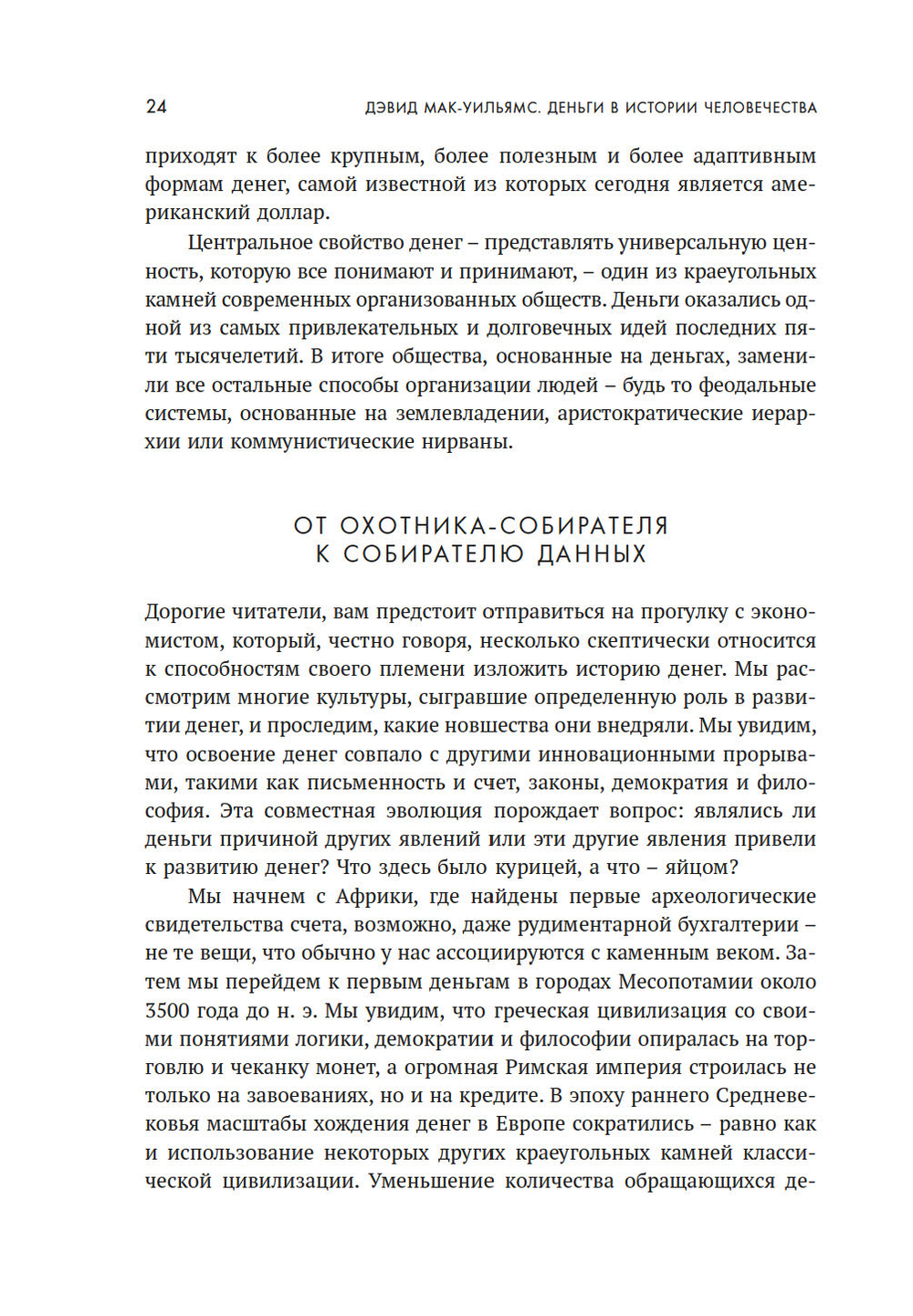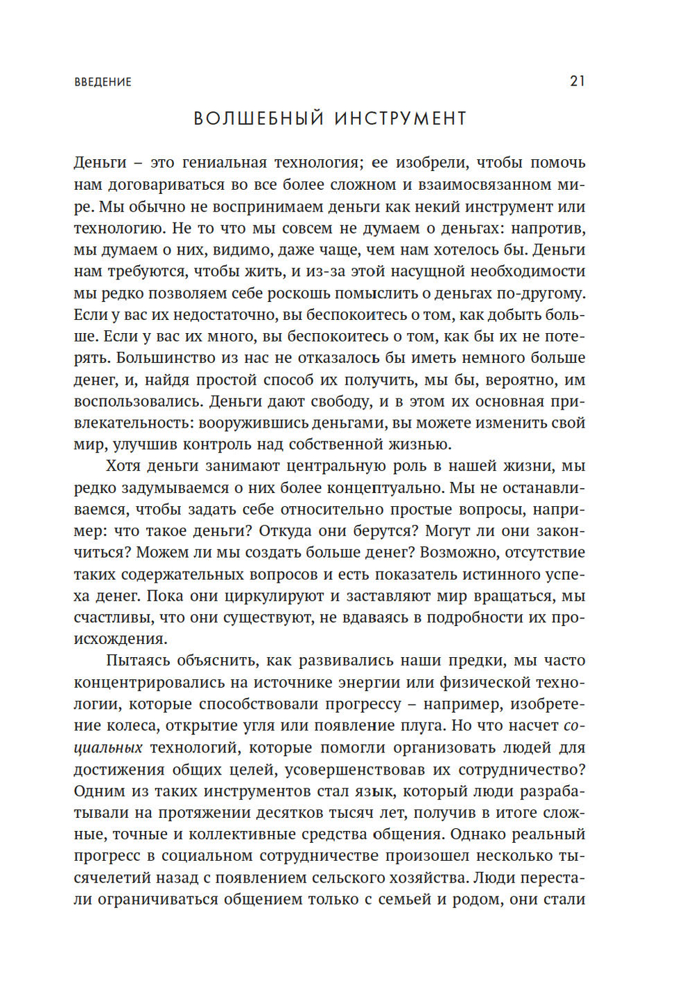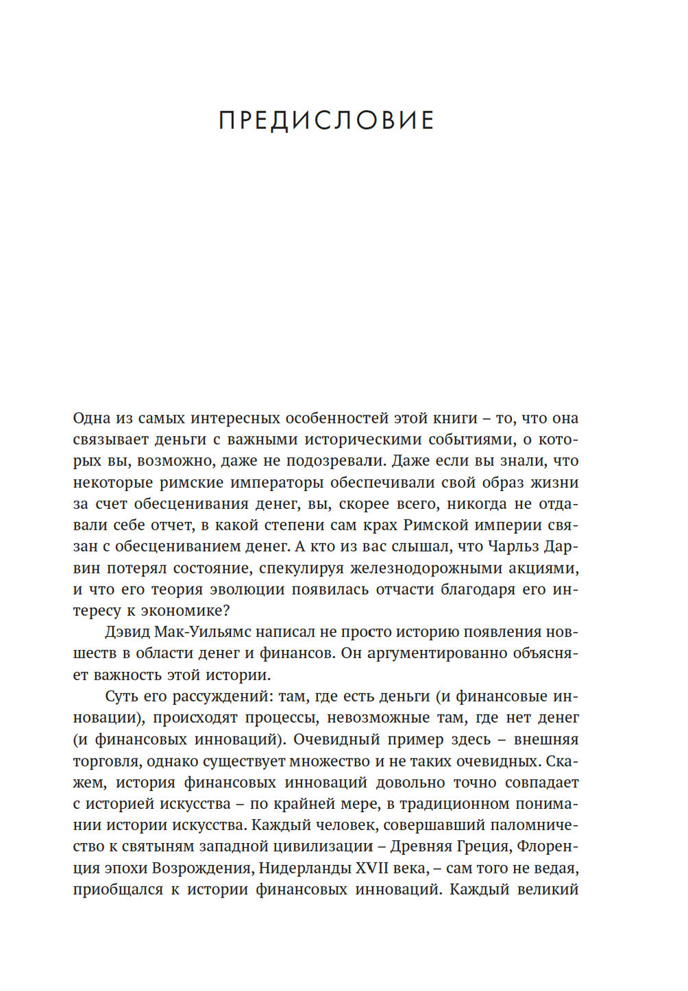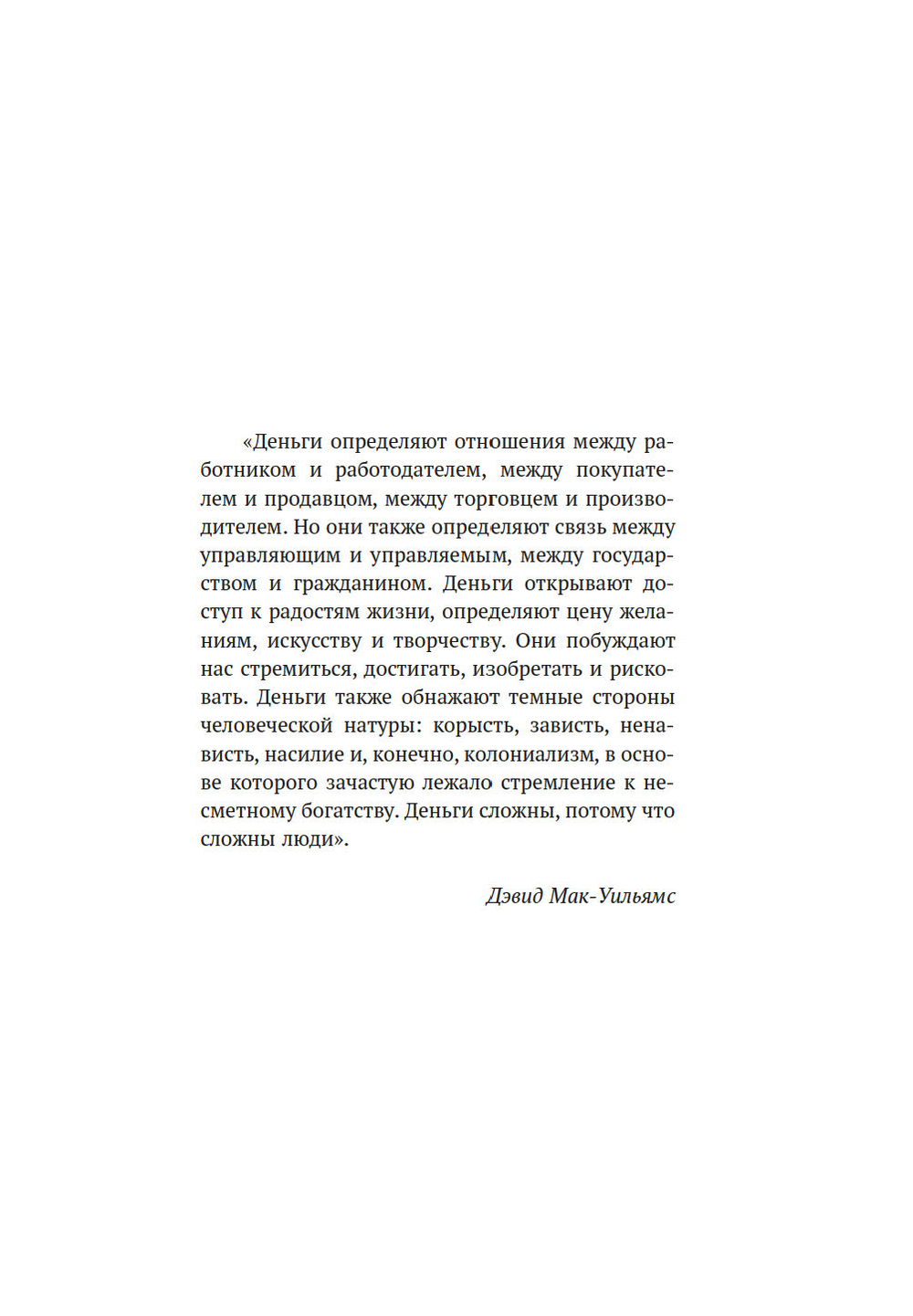 Ирландский экономист Дэвид Мак-Уильямс исследует неразрывную связь между прогрессом человечества и деньгами – от глиняных табличек Месопотамии до современных криптовалют. Ни одна инновация не определяла эволюцию вида Homo sapiens так глубоко и радикально, как деньги. Однако несмотря на их абсолютное доминирование в наших умах и поведении, большинство из нас по-настоящему не понимают роли и сущности денег. Откуда они берутся? Сколько их в мире? Кто их реально контролирует?