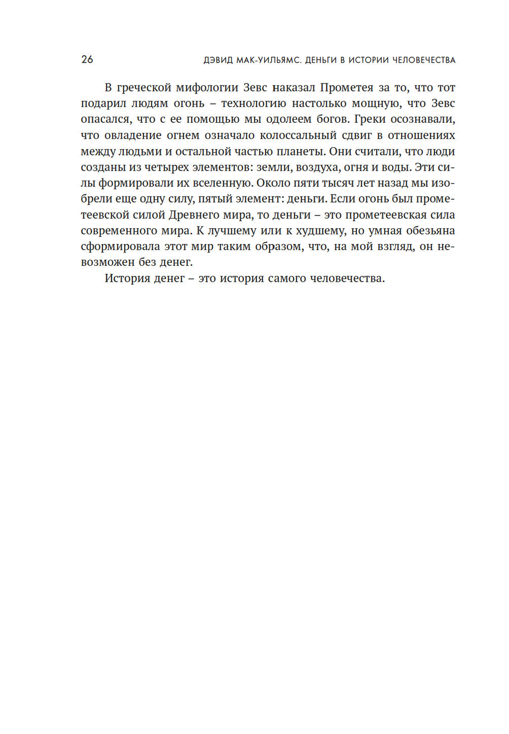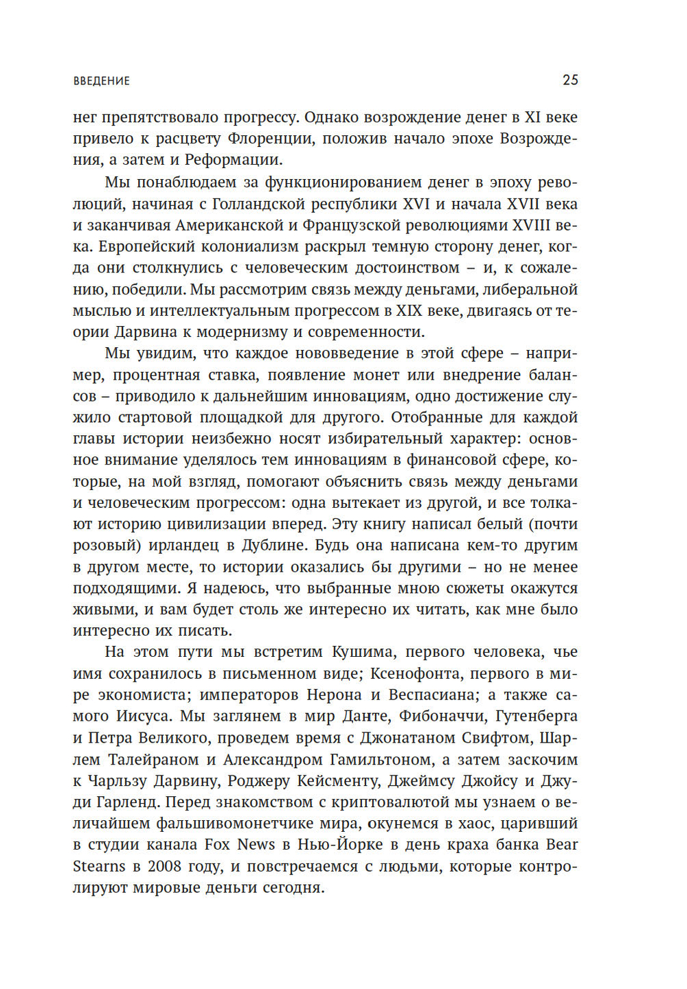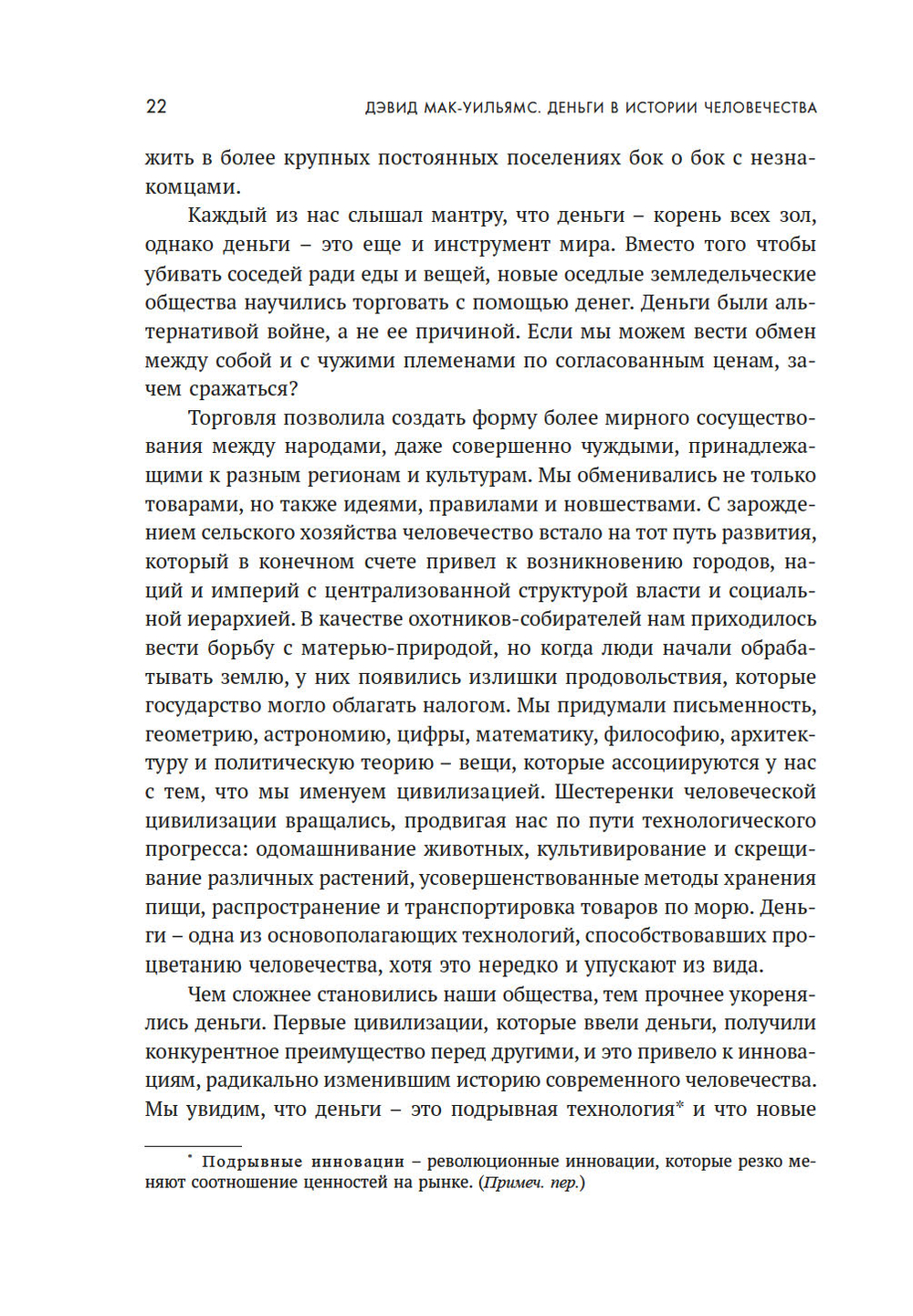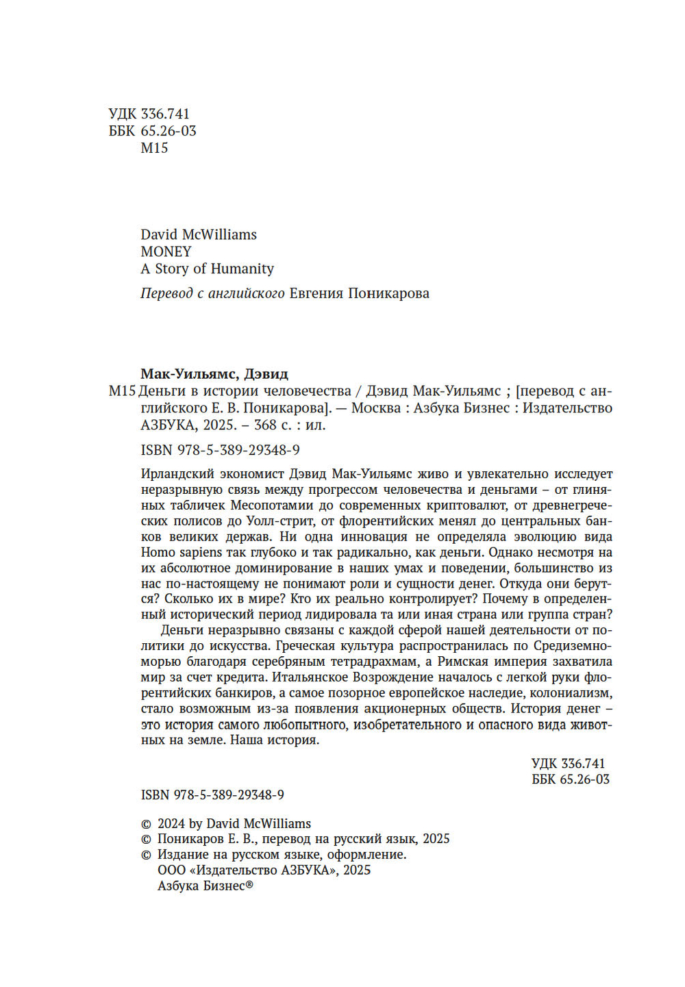 Ирландский экономист Дэвид Мак-Уильямс исследует неразрывную связь между прогрессом человечества и деньгами – от глиняных табличек Месопотамии до современных криптовалют. Ни одна инновация не определяла эволюцию вида Homo sapiens так глубоко и радикально, как деньги. Однако несмотря на их абсолютное доминирование в наших умах и поведении, большинство из нас по-настоящему не понимают роли и сущности денег. Откуда они берутся? Сколько их в мире? Кто их реально контролирует?