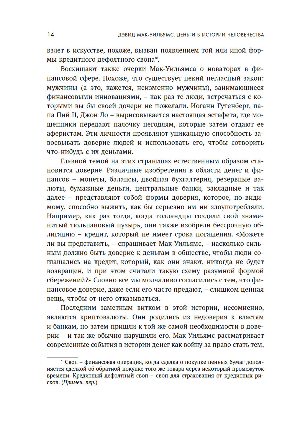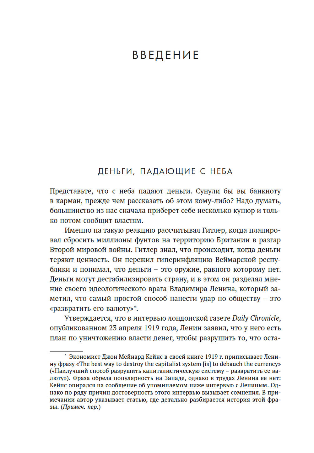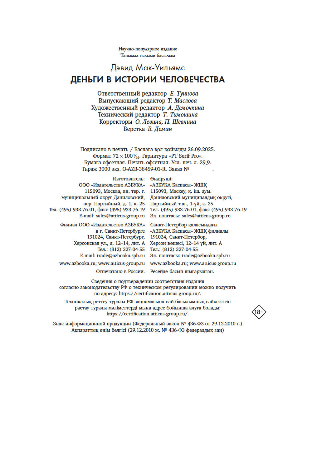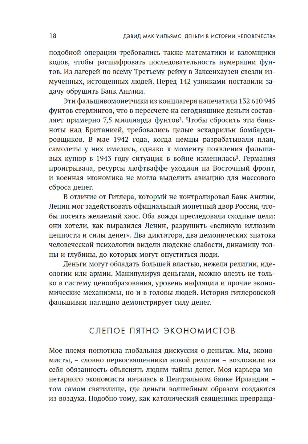 Ирландский экономист Дэвид Мак-Уильямс исследует неразрывную связь между прогрессом человечества и деньгами – от глиняных табличек Месопотамии до современных криптовалют. Ни одна инновация не определяла эволюцию вида Homo sapiens так глубоко и радикально, как деньги. Однако несмотря на их абсолютное доминирование в наших умах и поведении, большинство из нас по-настоящему не понимают роли и сущности денег. Откуда они берутся? Сколько их в мире? Кто их реально контролирует?