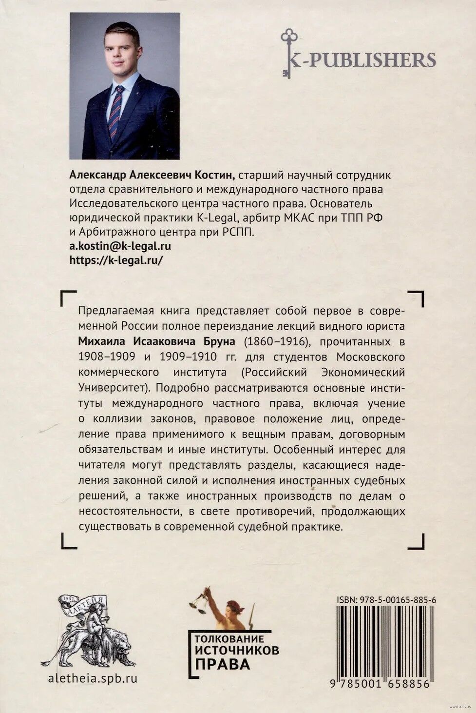 В работе подробно рассматриваются основные институты международного частного права, включая учение о коллизии законов, правовое положение лиц, определение права применимого к вещным правам, договорным обязательствам и иные институты. Особенный интерес для читателя представляют разделы, касающиеся наделения законной силой и исполнения иностранных судебных решений, а также действия иностранных производств по делам о несостоятельности, в свете тех противоречий, которые существуют в современной судебной практике.