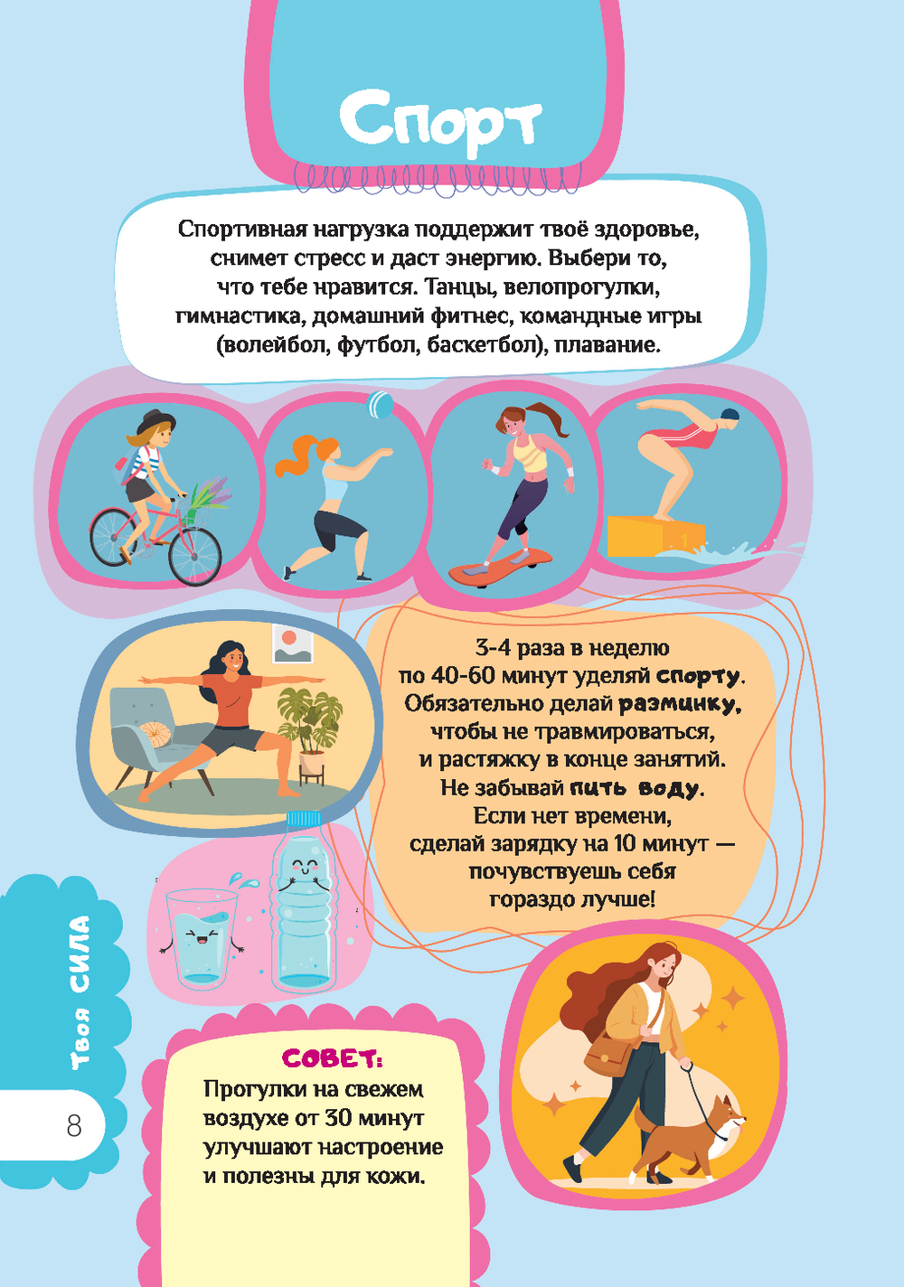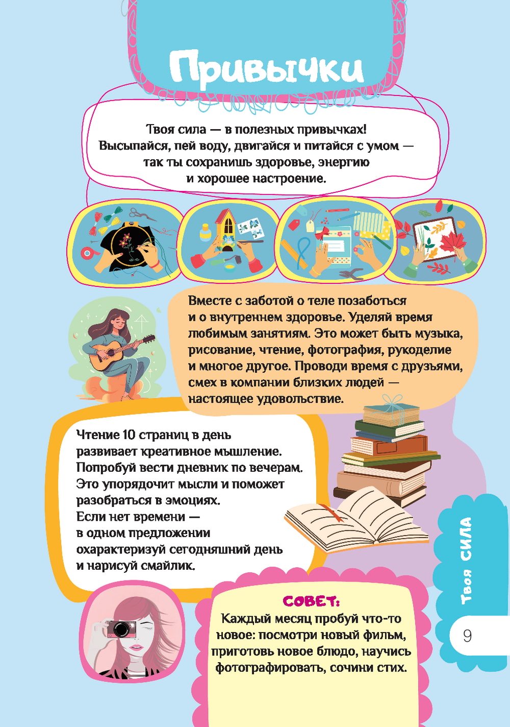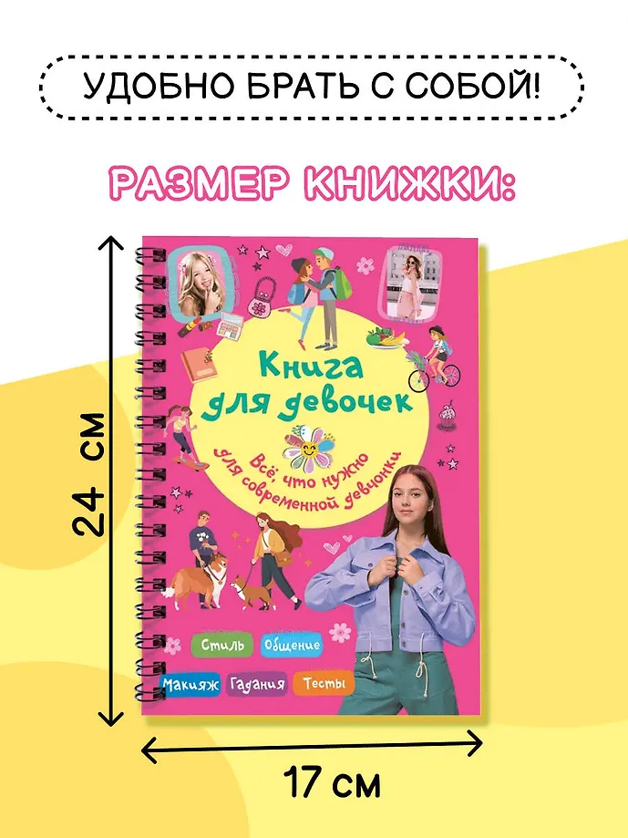 "Книга для девочек. Всё, что нужно для современной девчонки" создана специально для подростков 10-13 лет и содержит разделы о красоте и стиле, общении, лидерских качествах, диалоге с родителями, питании, гигиене, финансовой грамотности, безопасности в интернете и многом-многом другом. Книга удобна и практична – благодаря спирали страницы легко перекидываются из стороны в сторону, открываясь на 360 градусов.