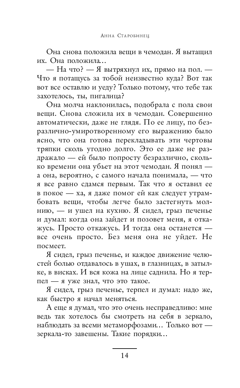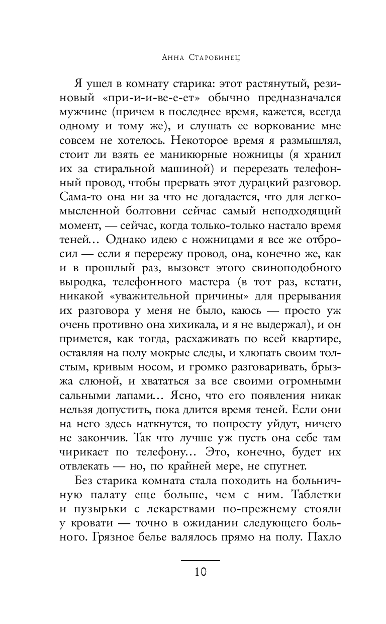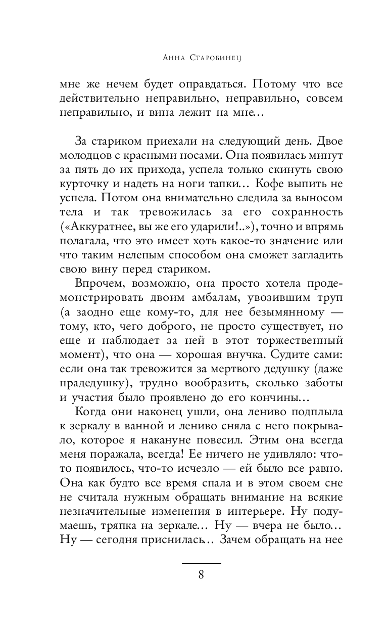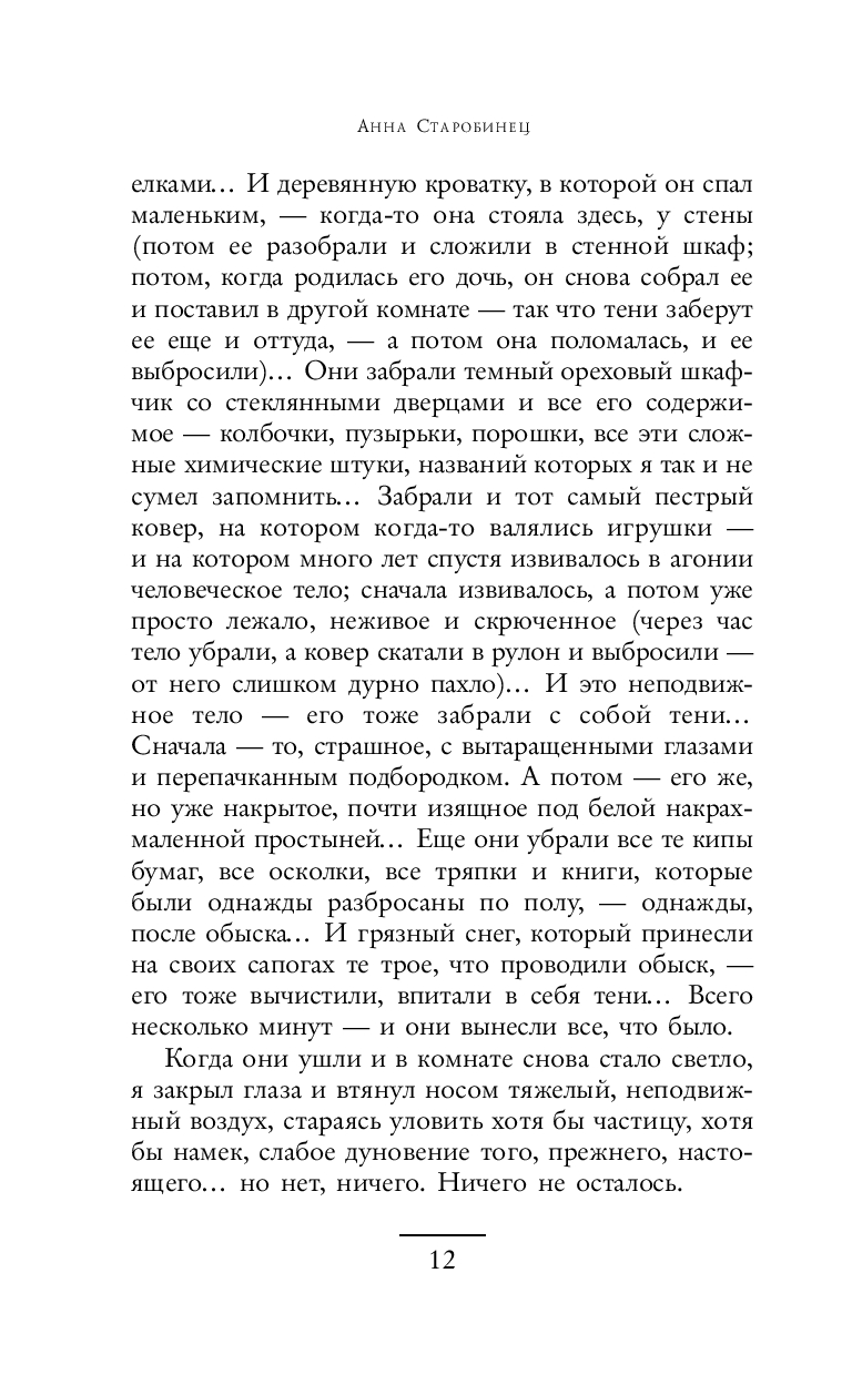 В повестях и рассказах Анны Старобинец обыкновенная жизнь совершенно обыкновенных людей неожиданно поворачивается к читателю своей мистической пугающей изнанкой. Параллельные миры, страшные тайны, домовые – всё переплетено и оставляет ощущение какой-то недосказанности. Анну Старобинец смело можно назвать отечественным Стивеном Кингом.