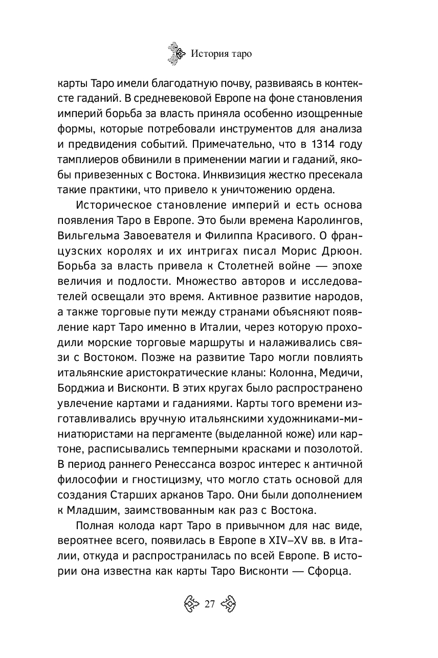 В нем подробно рассматривается структура Таро, история возникновения арканов, особенности разных школ и подходов, включая русскую, а также символика, связанная с цветами, числами, астрологией и каббалой. Автор рассказывает об истоках игральных и мистических карт, показывает, как менялась система Таро в разных культурах, и предлагает читателю цельную, стройную картину развития этой традиции.