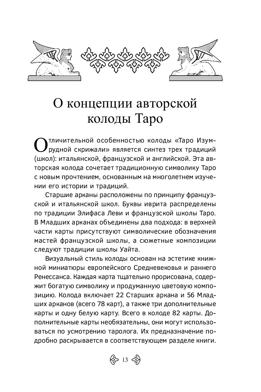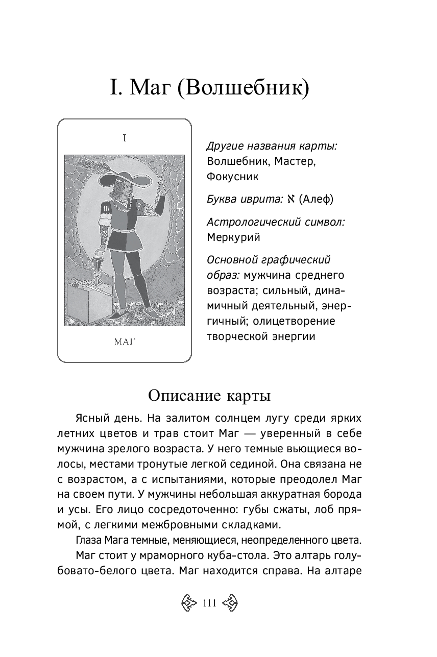 Особое внимание уделено описанию каждой карты авторской колоды: как классических старших и младших арканов, так и четырех дополнительных ("Любовь", "Волшебница", "Искусство" и белая карта). Каждое значение раскрывается через образ, архетип, литературные примеры, возможные профессии и астрологическое соответствие.
