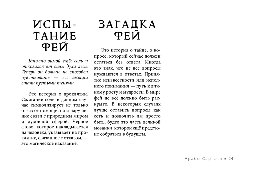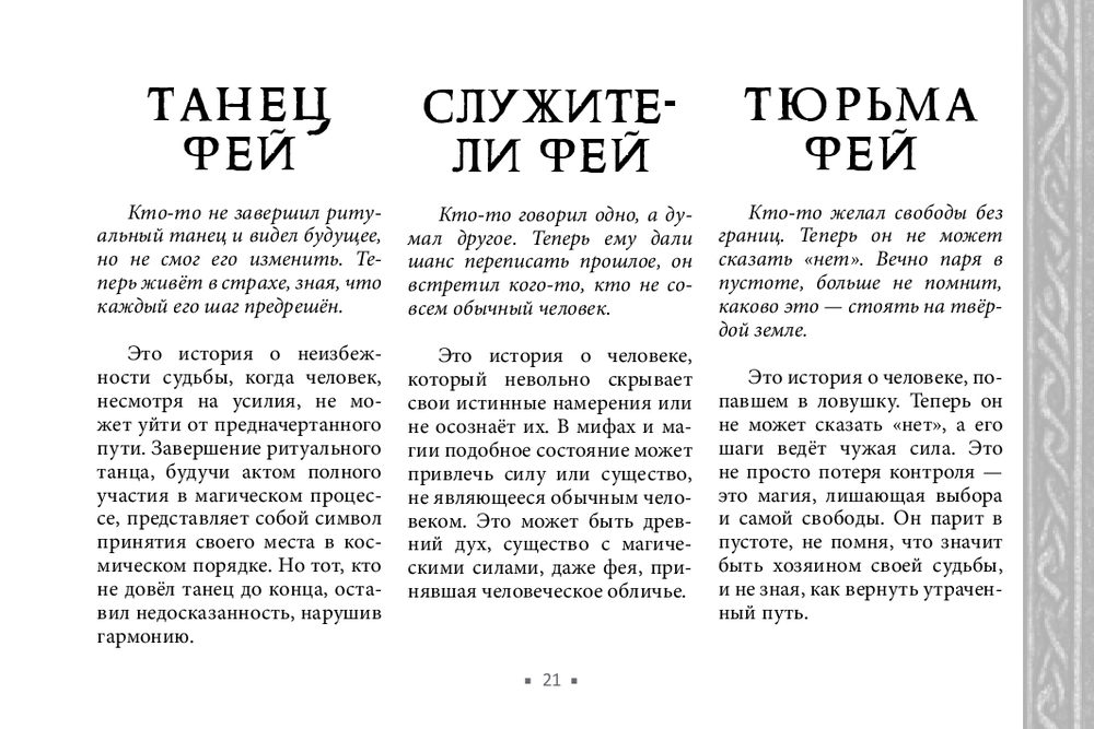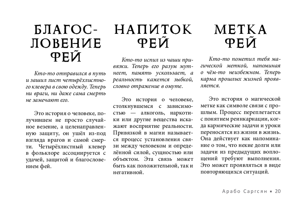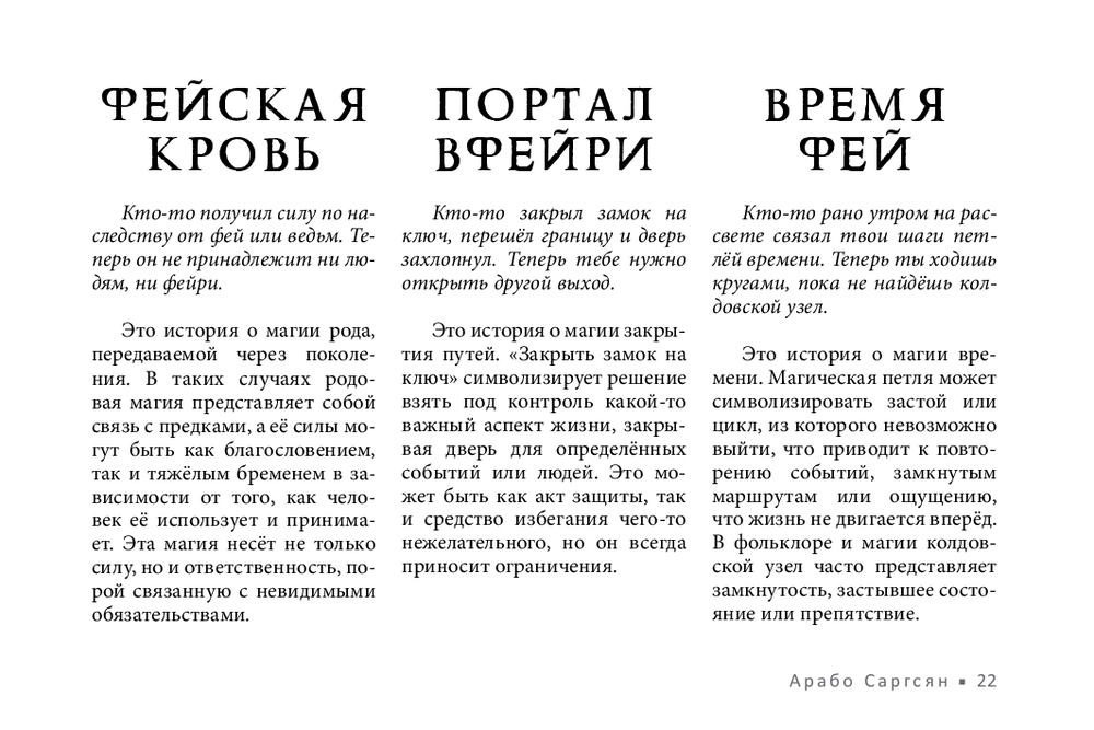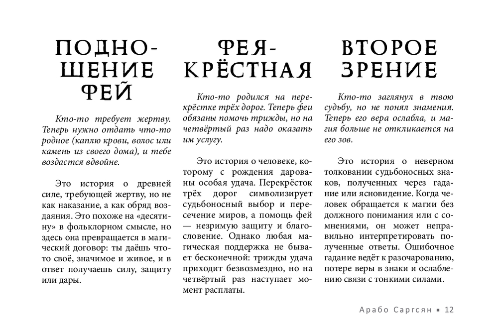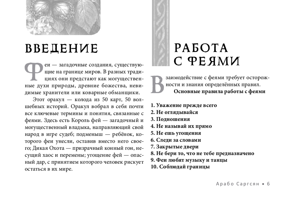 Не у всех есть возможность получить поддержку мастеров, практиков, тех, кто чувствует тонкий мир. В этом случае обнаружить и устранить чужое воздействие поможет новый оракул Арабо Саргсяна. Он был создан как навигатор по миру фейри – месту, где переплетаются мифы, магия и архетипы. Внутри колоды собраны ключевые фигуры и образы фейской традиции (Король фей, Дикая Охота, подменыш, угощение фей и др.). Освещаются темы фейской крови, магических печатей, скрытых порталов и следов, которые фейри могут оставить на судьбе человека. Каждая карта – это послание. Оно не всегда очевидно, но интуиция и внимание к деталям помогут его истолковать.
