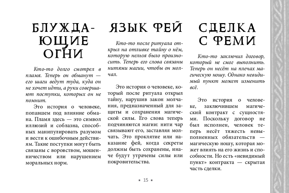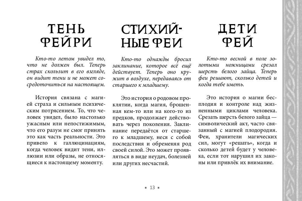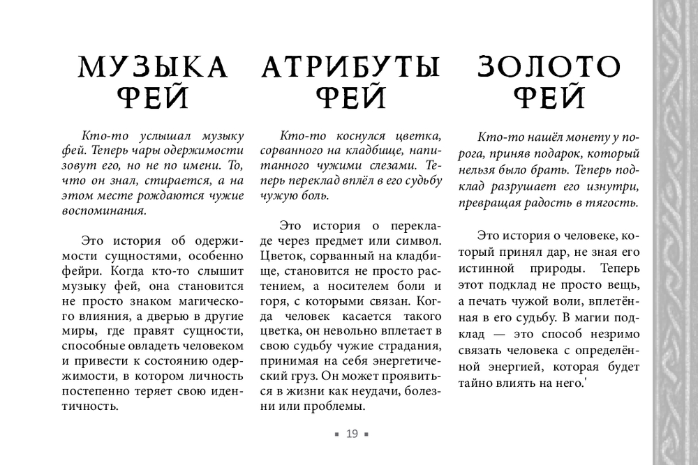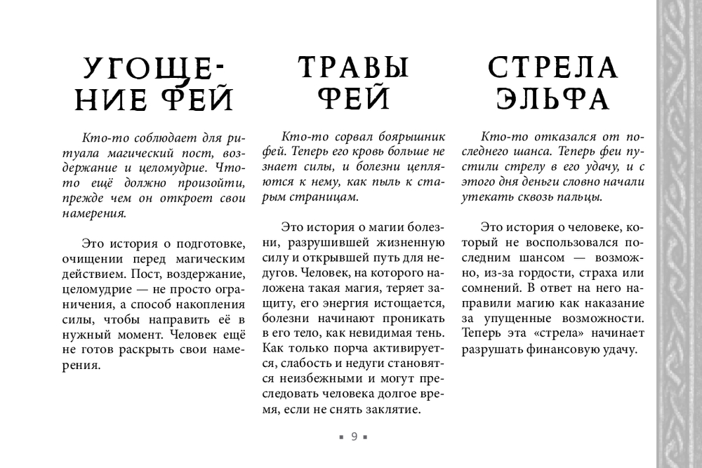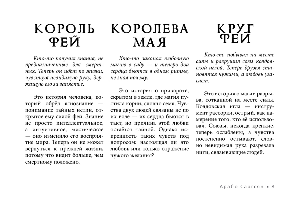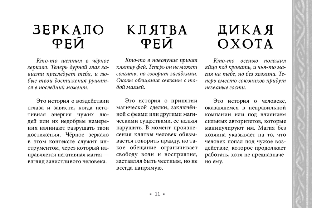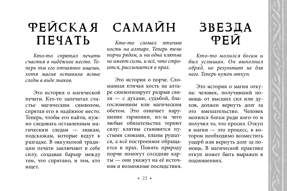 Не у всех есть возможность получить поддержку мастеров, практиков, тех, кто чувствует тонкий мир. В этом случае обнаружить и устранить чужое воздействие поможет новый оракул Арабо Саргсяна. Он был создан как навигатор по миру фейри – месту, где переплетаются мифы, магия и архетипы. Внутри колоды собраны ключевые фигуры и образы фейской традиции (Король фей, Дикая Охота, подменыш, угощение фей и др.). Освещаются темы фейской крови, магических печатей, скрытых порталов и следов, которые фейри могут оставить на судьбе человека. Каждая карта – это послание. Оно не всегда очевидно, но интуиция и внимание к деталям помогут его истолковать.