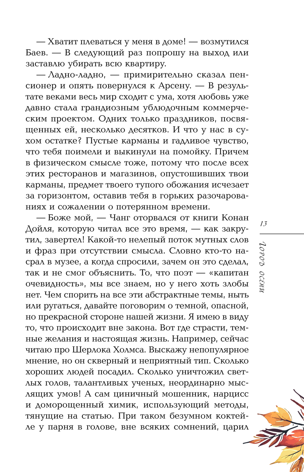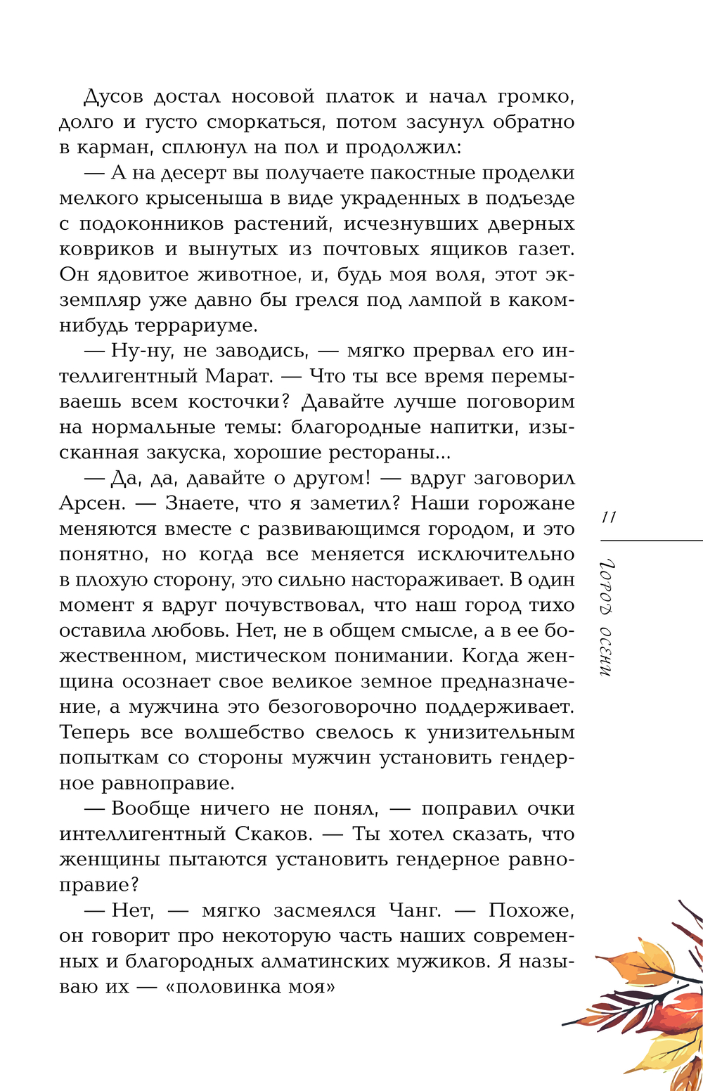 Что делать, если на вас внезапно свалились незаслуженные слава и деньги, а следом – таинственные угрозы, шантаж, анонимные письма и сводящие с ума происшествия? Эти события могли произойти в любом большом городе, но в этой книге мы проваливаемся в осеннюю, насквозь Алматинскую историю, где осторожный и лишенный амбиций журналист Ролан Баев, а также лихая компания его эксцентричных друзей, оказываются в центре загадочной интриги, взбудоражившей все слои городского сообщества. Здесь влажный, наполненный смогом, ностальгией, меланхолией, надеждой и кулинарными изысками город становится одним из главных героев. В светлый мир тонких интеллигентов, язвительных авантюристов, неловких фантазеров, поэтов и неврастеников врывается нечто таинственное, роковое и опасное. Получилось смешное и страшное чтение.